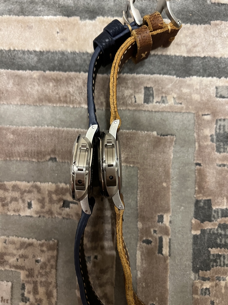 Доброго времени суток уважаемые форумчане . Раз моя тема с радиками растянулась аж на 5 страниц , и это не предел по всей видимости , я решил создать подобную тему про Люминоры из моего сета. Сразу оговорюсь что я не претендую на чувства «верующих» и не посягаю на славу и доблесть 000, 111, 112, 177, 372, 422 и конечно же Грааля Панерисити - 233. Я просто в рамках форумного общения пытаюсь поделиться радостью от обладания теми Люминорами которые у меня прижились, путем естественного отбора . Прошу любить и жаловать - 1351 и 0723 (аналог 1312, но с браслетом). Часы на первый взгляд , особенно обывателя - одинаковые . Но бывалый панерист сразу скажет что там одинаковый только мех и форма корпуса . Остальное - разное ! Сталь / титан , черный цифер / табак, стрелы золотые / стальные . Разный вес и разное восприятие на руке . Фунционал - как я люблю - автомат на три дня и дата. Малая секунда , на корпусе полированные и матовые участки , толщина из за нового 9010 меха - приемлемая для частого ношения при моей руке 17,5. Одним словом сплошной Памо - кайф. Все строго ИМХО. Каждый найдет свой Панерай !