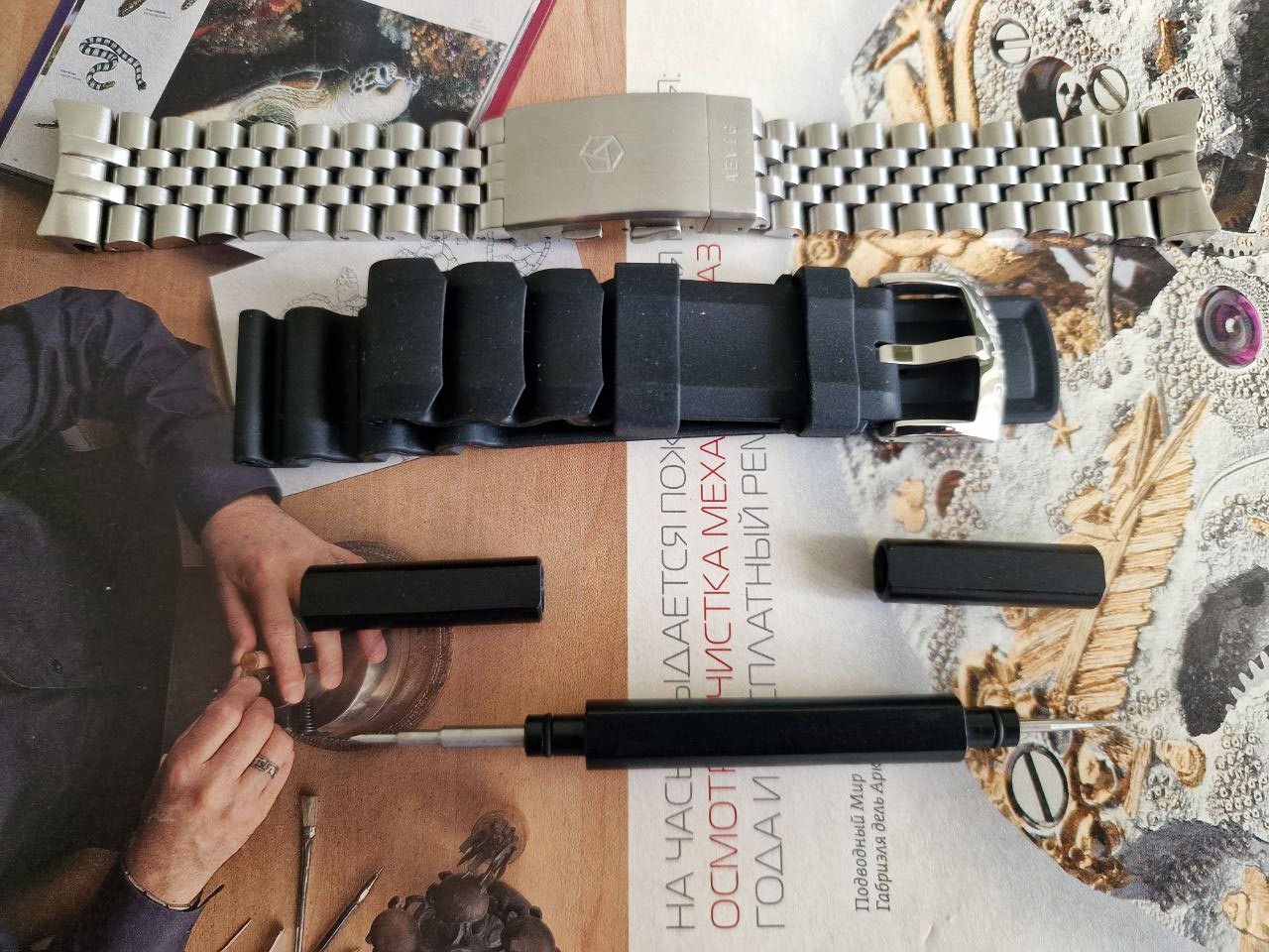Комплект полный. В дополнение к оригинальному браслету ( доп звенья в комплекте ) и черному заводскому каучуку - симпатичный зеленый ремень ( фото на нём ).