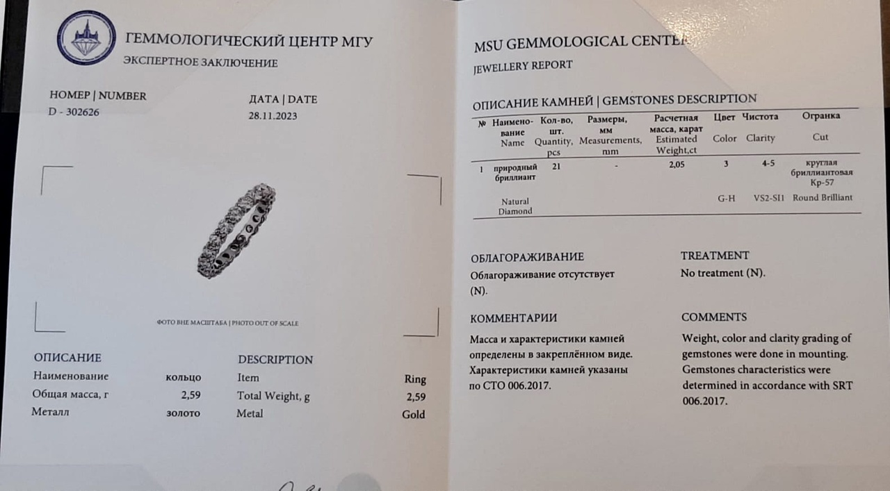 Аттестат ювелирного изделия геммологической лаборатории МГУ.