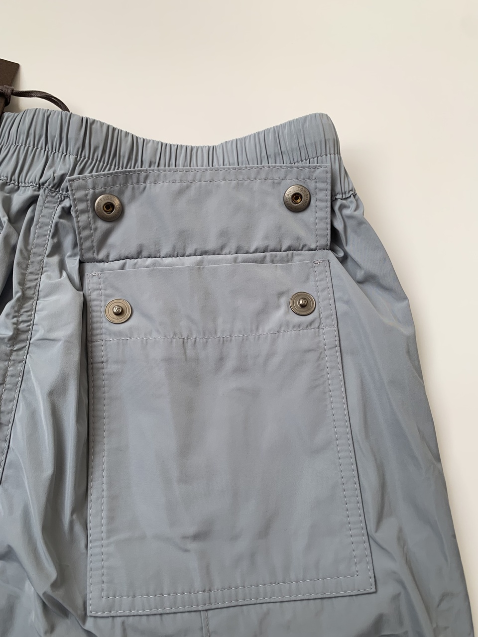 Брюки изготовлены из быстросохнущей нейлоновой ткани,что позволяет не сковывать движения при ходьбе и занятиях спортом.Пояс с резинкой регулируется с помощью шнурка,внизу брючин металические молнии с крупным брендированным бегунком.Боковые,прорезные карманы спереди,накладные карманы сзади имеют застёжку на пуговицы-клёпки с логотипом дизайнера.