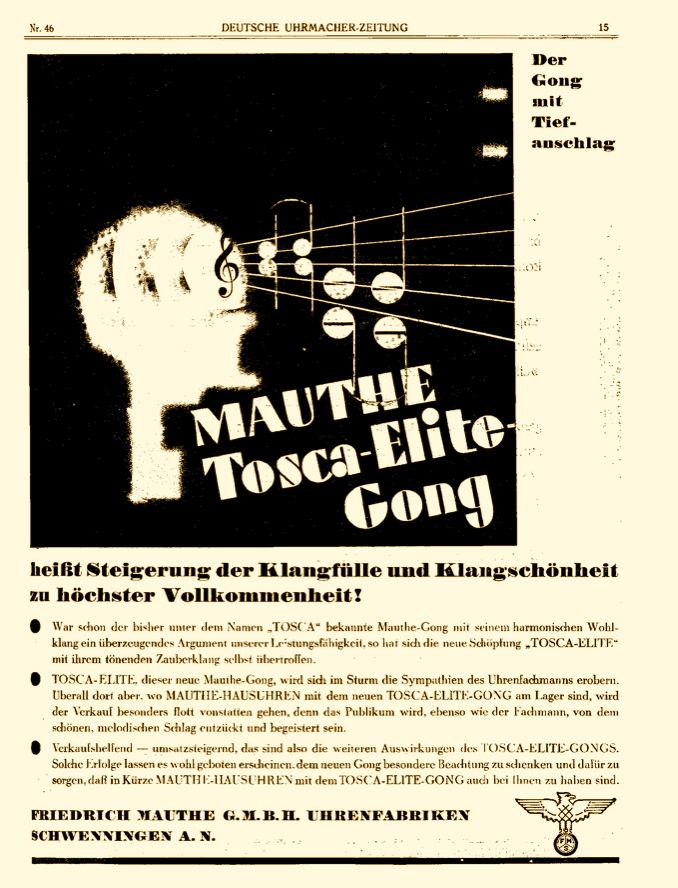 "Добавление низких тонов увеличевает богатство и красоту звука гонга, доводя его до высочайшего совершенства! В то время как гонг Мауте, ранее известный под названием TOSCA, своим гармоничным благозвучием уже был убедительным аргументом в пользу наших часов, новое творение «TOSCA-ELITE» превзошло само себя своим волшебным звуком. TOSCA-ELITE, этот новый гонг Mauthe, заслужит симпатии всех часовых экспертов. Но где бы напольные часы MAUTHE с новым гонгом TOSCA ELITE GONG ни появились на складе, продажи будут особенно оживленными, потому что публика будет так же, как и эксперты в восторге от красивого, мелодичного звука. Увеличение продаж - вот эффект TOSCA ELITE GONG. Обратите особое внимание на новый гонг, ведь напольные часы MAUTHE с ГОНГОМ TOSCA ELITE скоро станут доступны и Вам!"