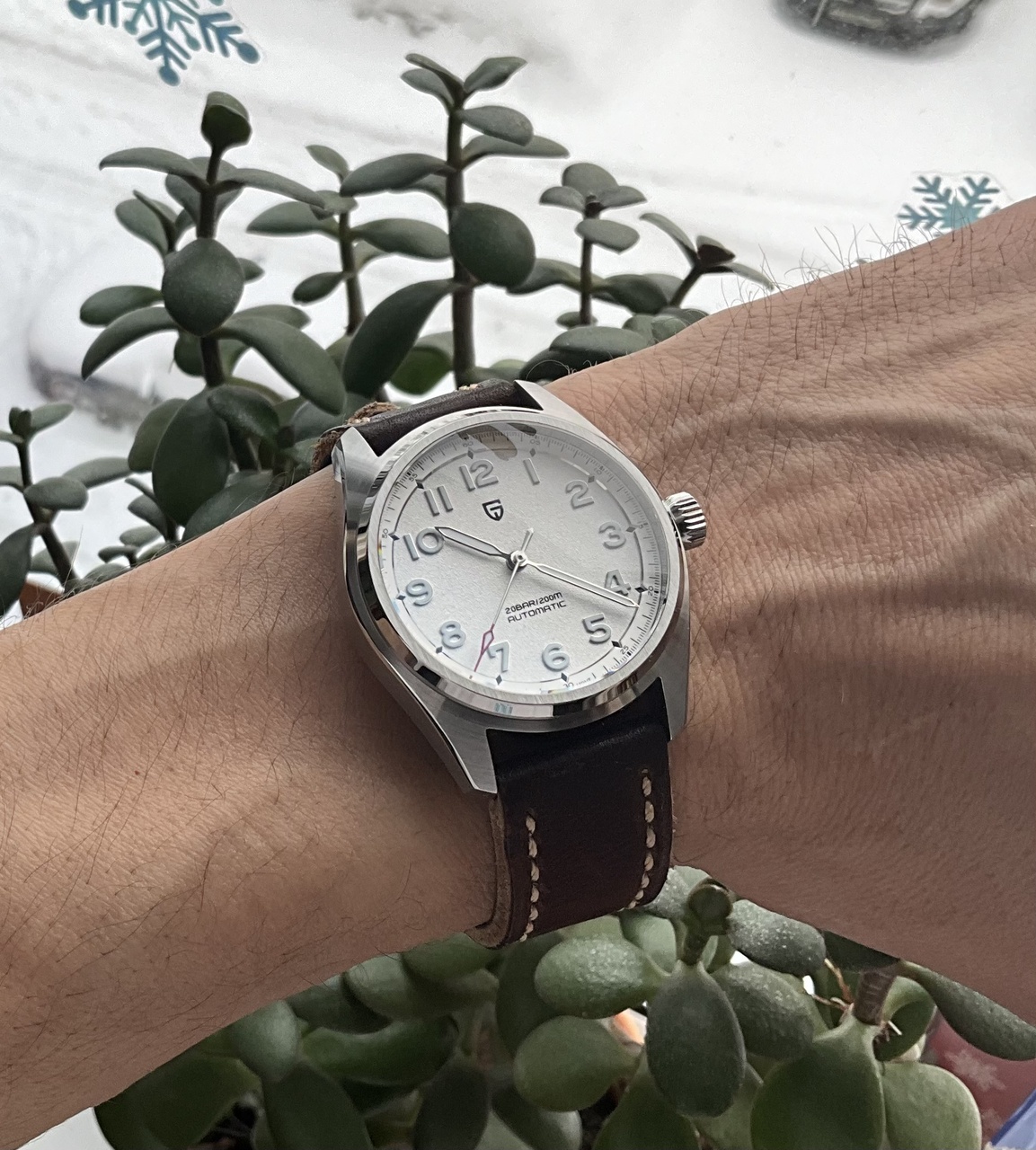 Часы, кстати, классные, лёгкие, очень читаемые и точные в плане механизма. На коричневом ремешке получилось здорово, как мне кажется.