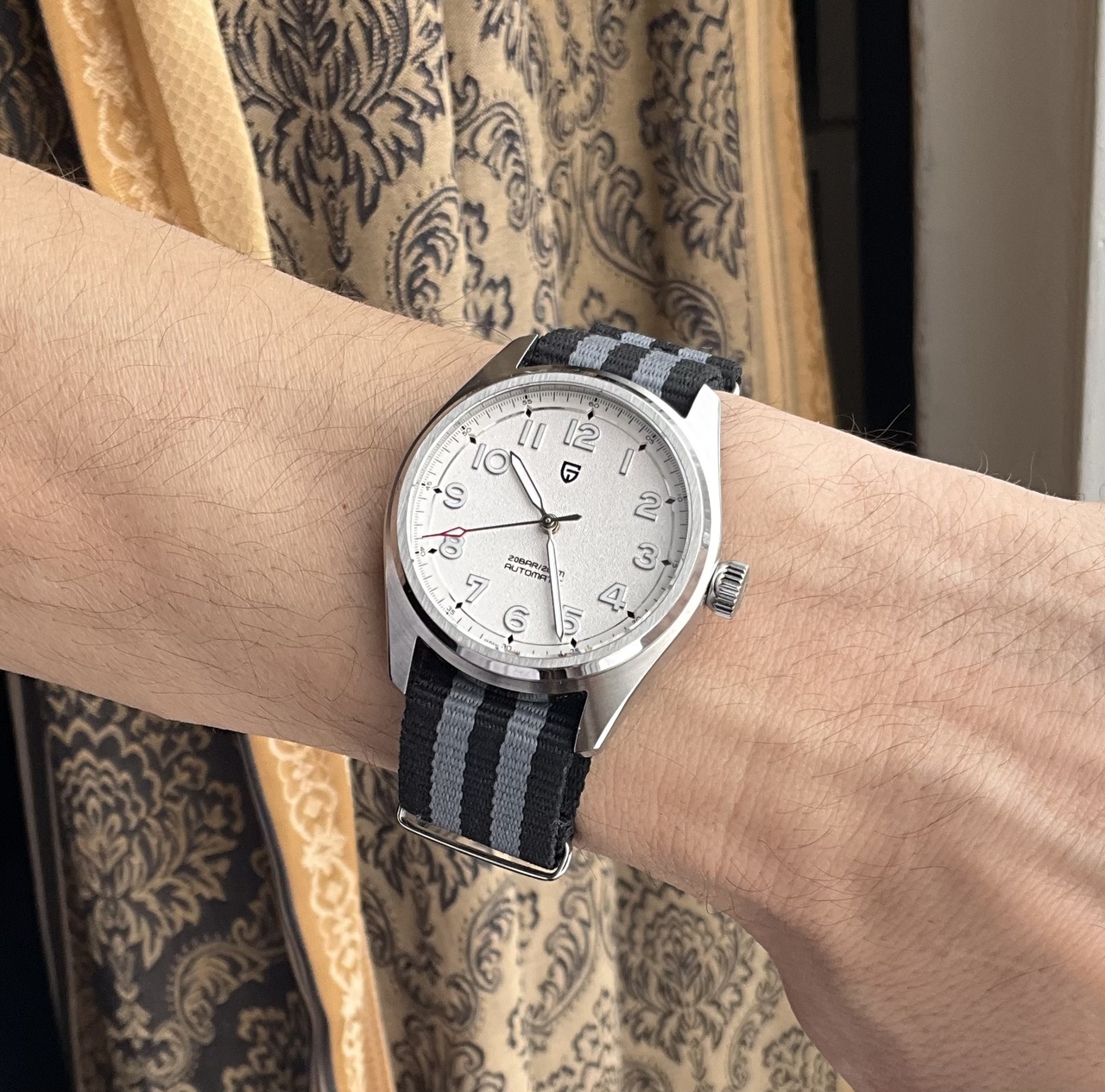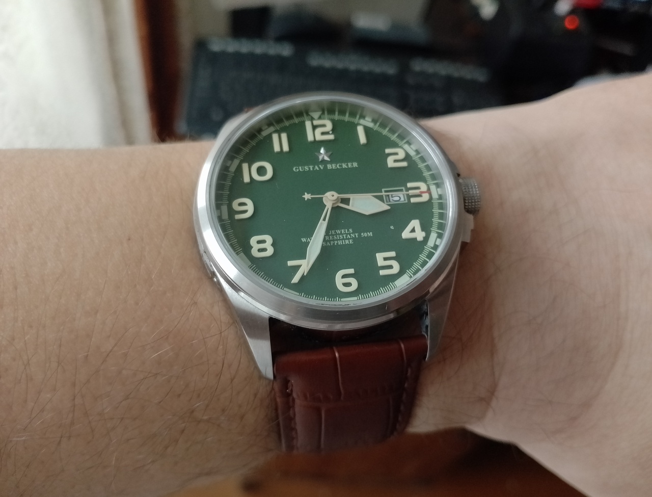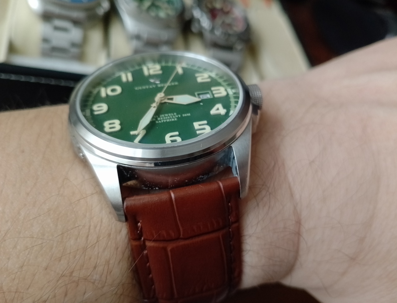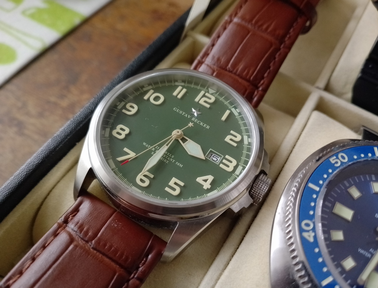 Всё ж-таки, вынужден согласиться с тем, что Густав не смотрится на браслете, попробовал два разных браслета, не зашло, пересадил на кожаный ремешок, получилось очень хорошо, аккуратно и благородно. Правильно говорили, что такие часы смотрятся исключительно на ремешке.