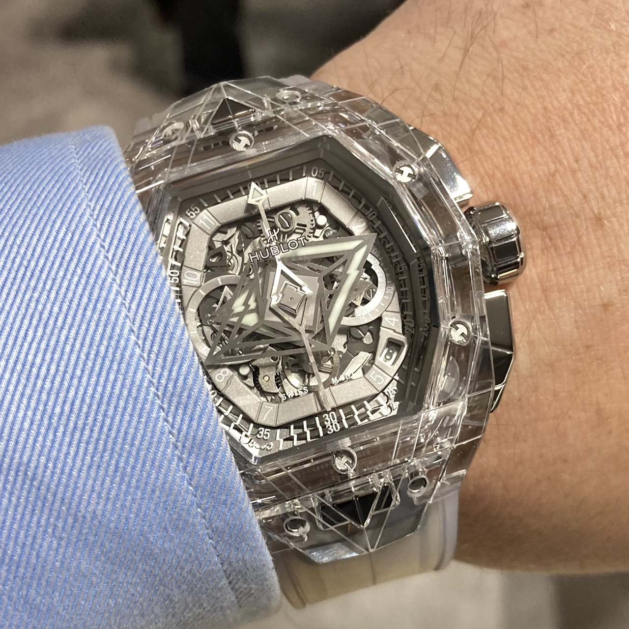 Теперь из сапфира создается не только циферблат, который и раньше позволял видеть сквозь дисковые стрелки часов, разработанные Sang Bleu, скелетонизированный механизм автоматического хронографа HUB4700, но и корпус и безель, что подчеркивает органичный дизайн часов. Сложность дизайна коллекции Spirit of Big Bang в сочетании с геометрией многоугольной татуировки Максима заставили нас выйти на новый уровень технологии обработки сапфира. Благодаря эффекту прозрачности сапфира чистота живых, но упорядоченных линий Sang Bleu выражается, как визуально, так и при ношении, в сверхлегком минималистическом стиле. Сапфировое стекло – удивительный и очень требовательный материал, полная прозрачность которого требует абсолютно безупречной отделки.