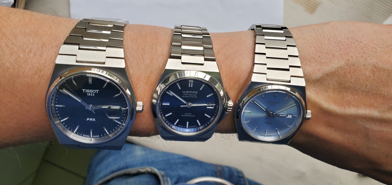 Wempe Glashütte Iron Walker 36 mm (толщина 10.0 мм, вес 115 гр, lug to lug 42мм) и две модели Tissot PRX 35mm (толщина 10 мм, вес 90 гр, lug to lug 39мм) и 40mm (толщина 10,6 мм, вес 123 гр, lug to lug 45мм). Вес указан без снятых звеньев браслета.