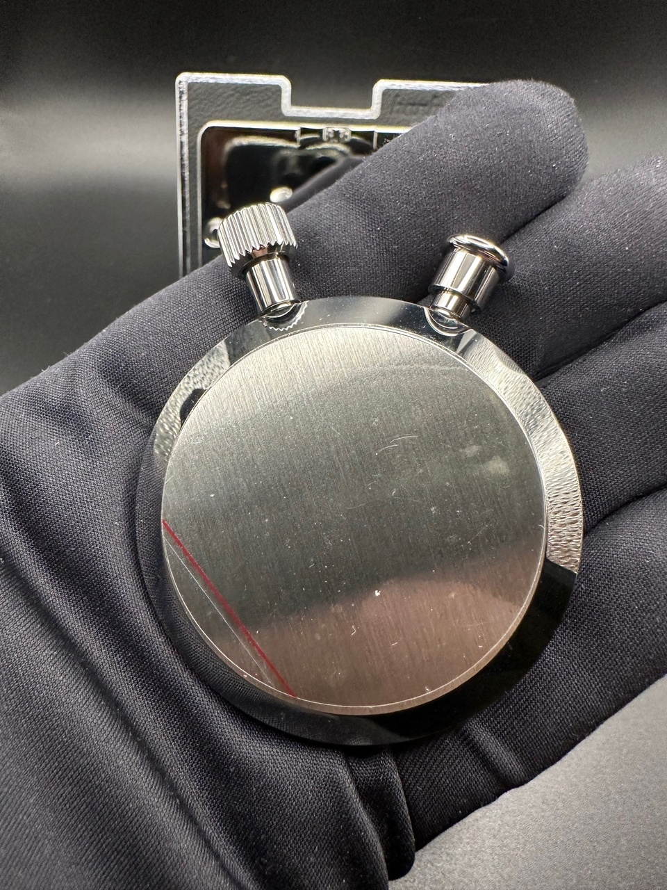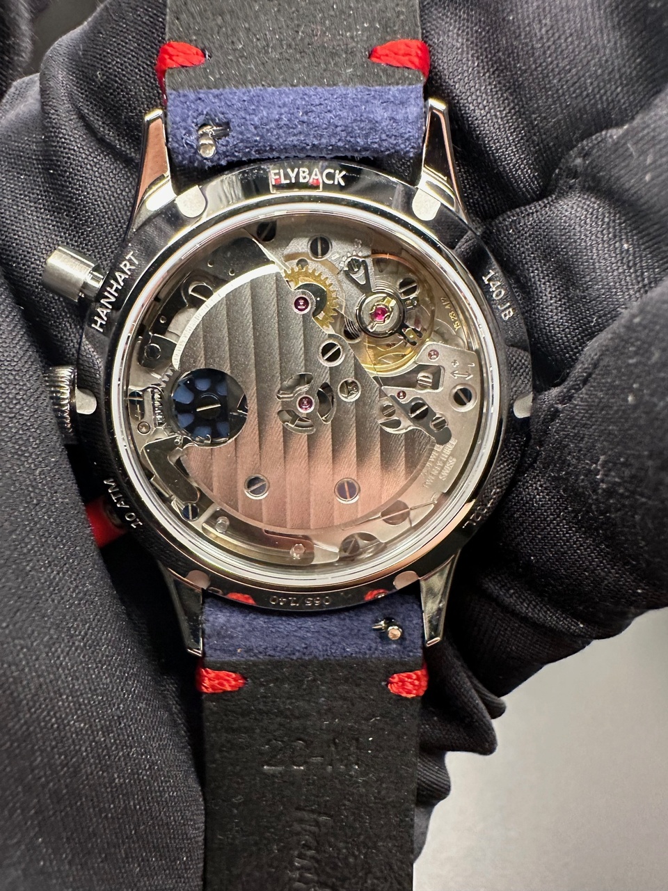 В секундомере, также как и часы, с функцией Flayback установлен собственный механизм Hanhart — caliber 122, стекло секундомера пластиковое.