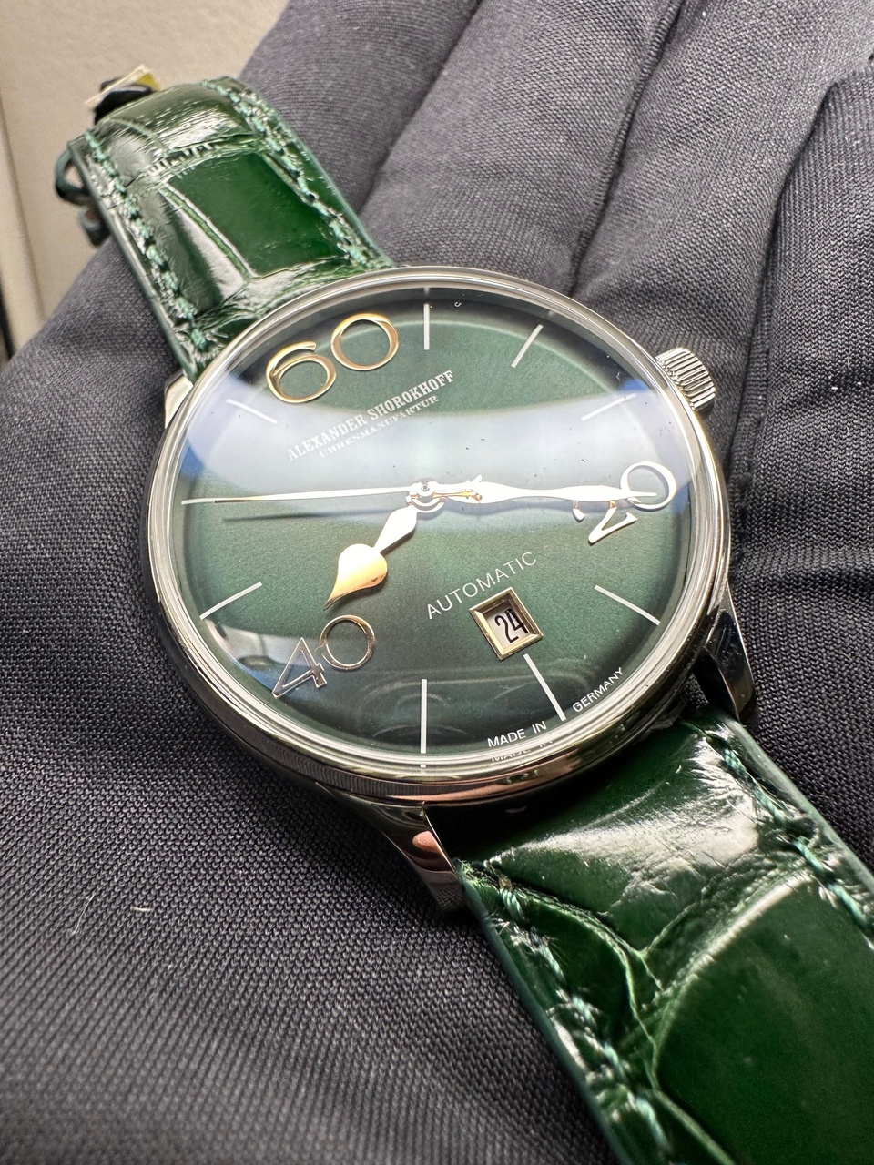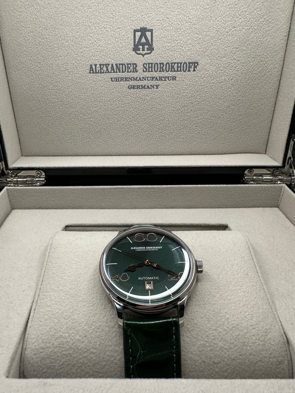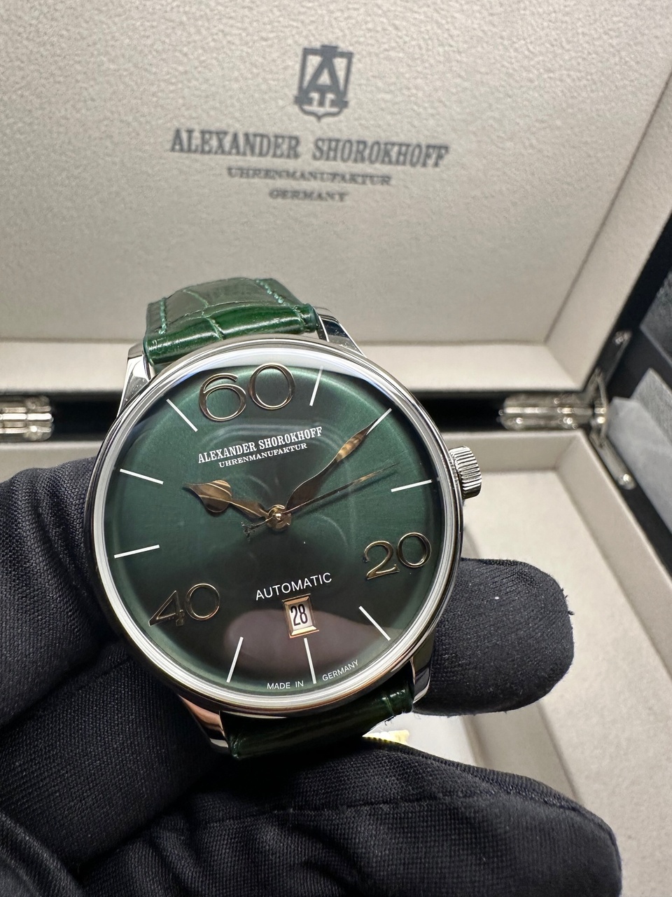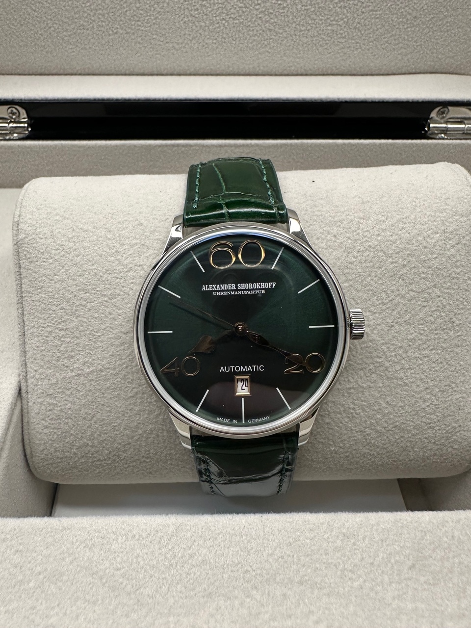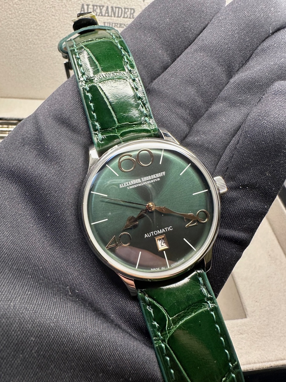 Модель Sixtythree, выполнена в запоминающемся стиле часов 60-х годов с фирменными стрелками от Alexander Shorokhoff и числами 20, 40, 60 на 4, 8 и 12 часов соответственно. Красивейший и "богатый" зеленый цвет циферблата дополняется зеленым ремешком выполненным из натуральной кожи крокодила, что довольно редко встречается в часах средней ценовой категории.