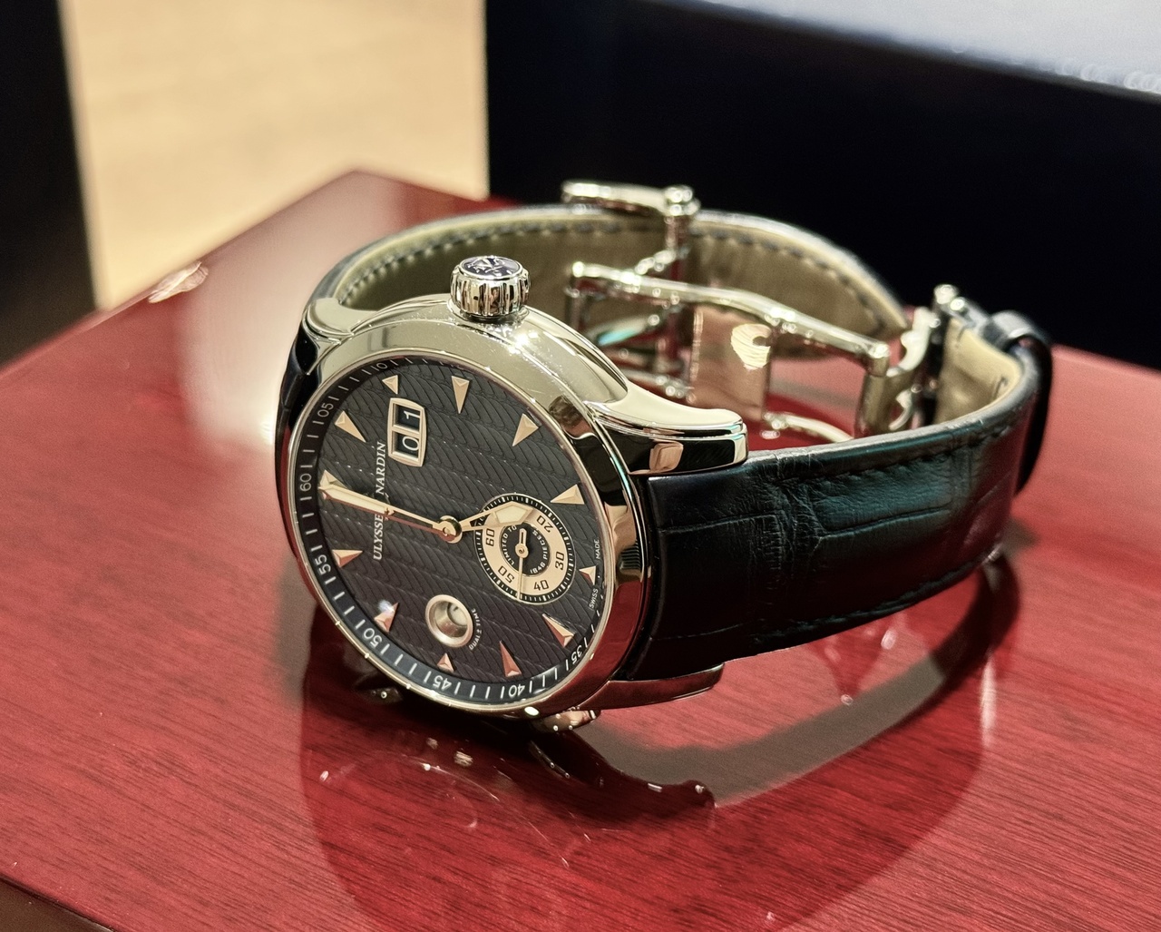 Шикарный мануфактурный калибр UN-334. Запас хода 48 часов. Большая дата. Окошко 24-часового прыгающего указателя времени второго часового пояса.