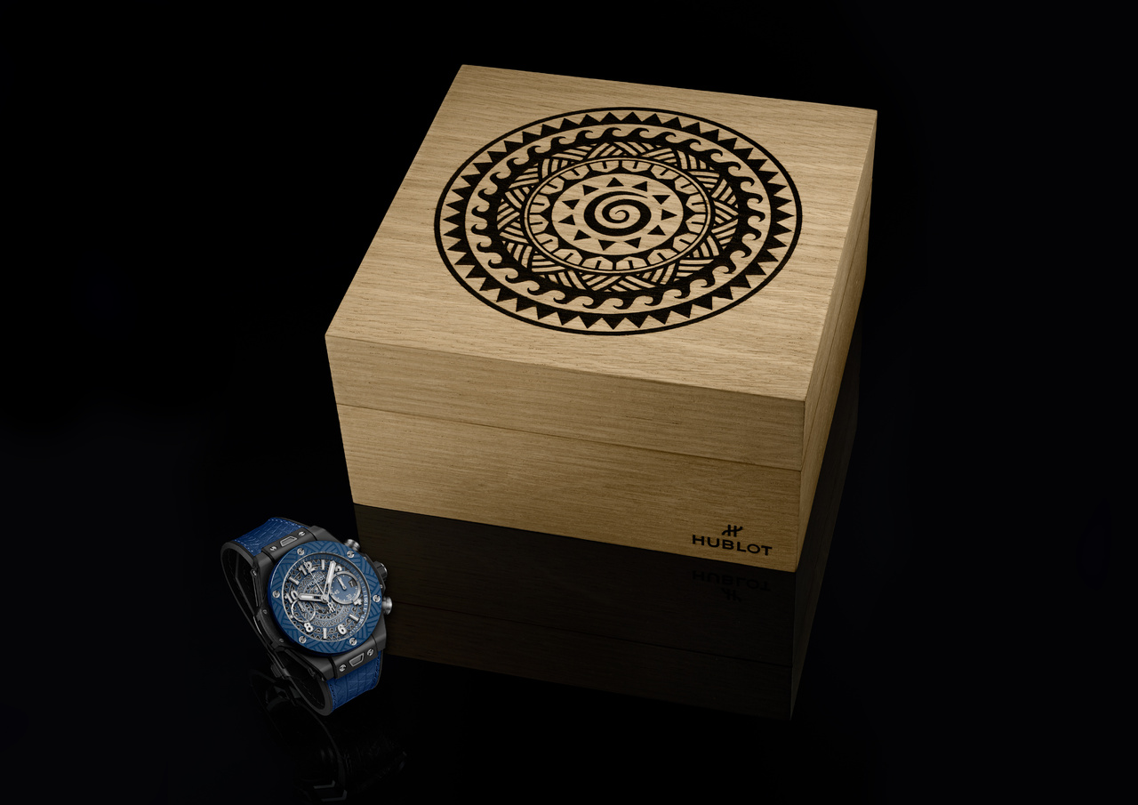 К каждому экземпляру часов также прилагаются два сменных ремешка: классический черный каучуковый ремешок Hublot и ремешок из телячьей кожи с тиснением, отражающим полинезийские мотивы.