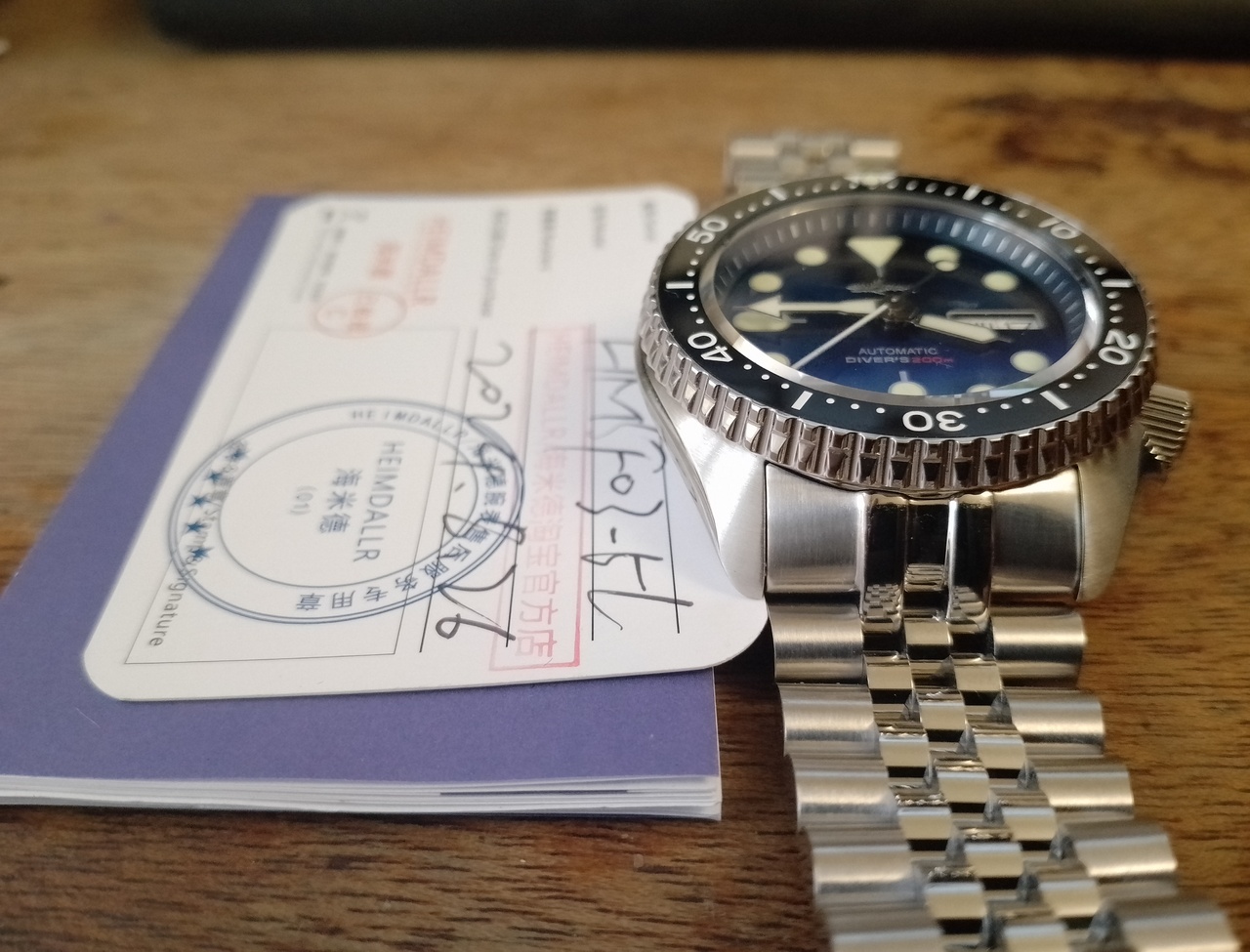 Приехали ко мне часики, хомаж на Seiko SKX007 от HeimDallr. Очень понравились, как и ожидалось - качество на высоте, заказал опять от HeimDallr, потому что у меня уже есть часы от этого китайского бренда (хомаж на Seiko Monstr v3 в бардово-рубиновом варианте). Исполнение очень понравилось, качество отличное, цвет циферблата - это просто нечно неописуемое, на фотографиях у продавца он смотрится как чёрный, хотя заявлен как синий, на самом деле, в живую, он почти чёрный с очень глубоким отливом в тёмно-тёмно синий (чернильный), я бы сказал - цвет ночного океана - класс! Я как раз не хотел синий, а хотел почти чёрный, так и есть. То ли это играет антибликовое тёмно-синее покрытие стекла, то ли циферблат имеет такой классный оттенок. Сапфировое стекло имеет небольшую фаску по краю, что придаёт дополнительного шарма, метки чуть преломляются при некоторых ракурсах. Взял специально на юбилейном браслете, никогда не было у меня такого, а обычный трёхзвенный ойстер как-то уже поднадоел. Снял четыре звена, в комплекте станочек и мини-вилочка для снятия шпилек, талончик гарантийный и книжка-мануал. Коробка сама добротная. Вообще, у HeimDallr традиционно - отличная комплектация и упаковка, определённо могу сказать, что это теперь один из моих любимых микро-брендов. Отделка по корпусу очень аккуратная, стекло - сапфир, безель имеет керамическую вставку и левостороннюю трещётку на 120 кликов, причём вращение очень приятное на слух с характерным сдвоенным щелчком, очень классное! Заводная головка большая, ухватистая и имеет очень большое количество витков, что здорово! Юбилейный, пятисоставной браслет выглядит довольно просто, но я от него и не ждал каких-то чудес особенных, застёгивается, удобный, да и ладно; укорачивается легко, в комплекте станочек для выталкивания межзвенных шпилек. Люм заявлен C3 швейцарская люминова, по факту, она и есть, светится очень сильно от кратковременного засвечивания любым источником света, как долго будет светиться, не знаю, кому интересно, могу отписаться завтра. Давно хотел этот вариант дайвера хомаж на SKX007, необычные стрелки, большие круглые метки, отличная читаемость! Долго изучал тему рождения SKX007 от самых первых дайверов Сейко 62MAS и до Seiko 5, дизайны на столько похожи, что не понятно, собственно, на какую модель это хомаж, то ли на SKX007, то ли на Seiko 5, но получилось классно. Длиннющая секундная стрелка с точкой-противовесом очень эффектно смотрится. Часы не тяжёлые, видимо, отчасти из-за юбилейного лёгкого браслета. Что могу сказать: приятно держать в руках, приятно на них смотреть, приятно их носить, реально получаю удовольствие от использования! Могу снять видео, если кому надо. Короче - рекомендую. В плане цены, средняя цена на известной площадке варьируется от 12 до 16 т.р. Мне удалось ухватить за 11800р. по акции!