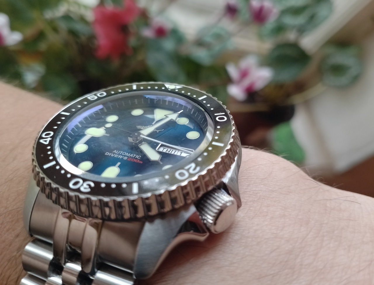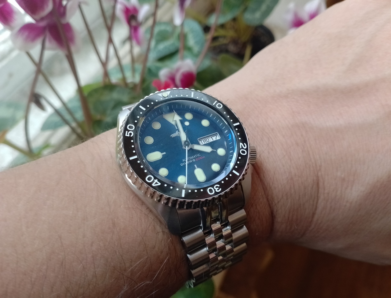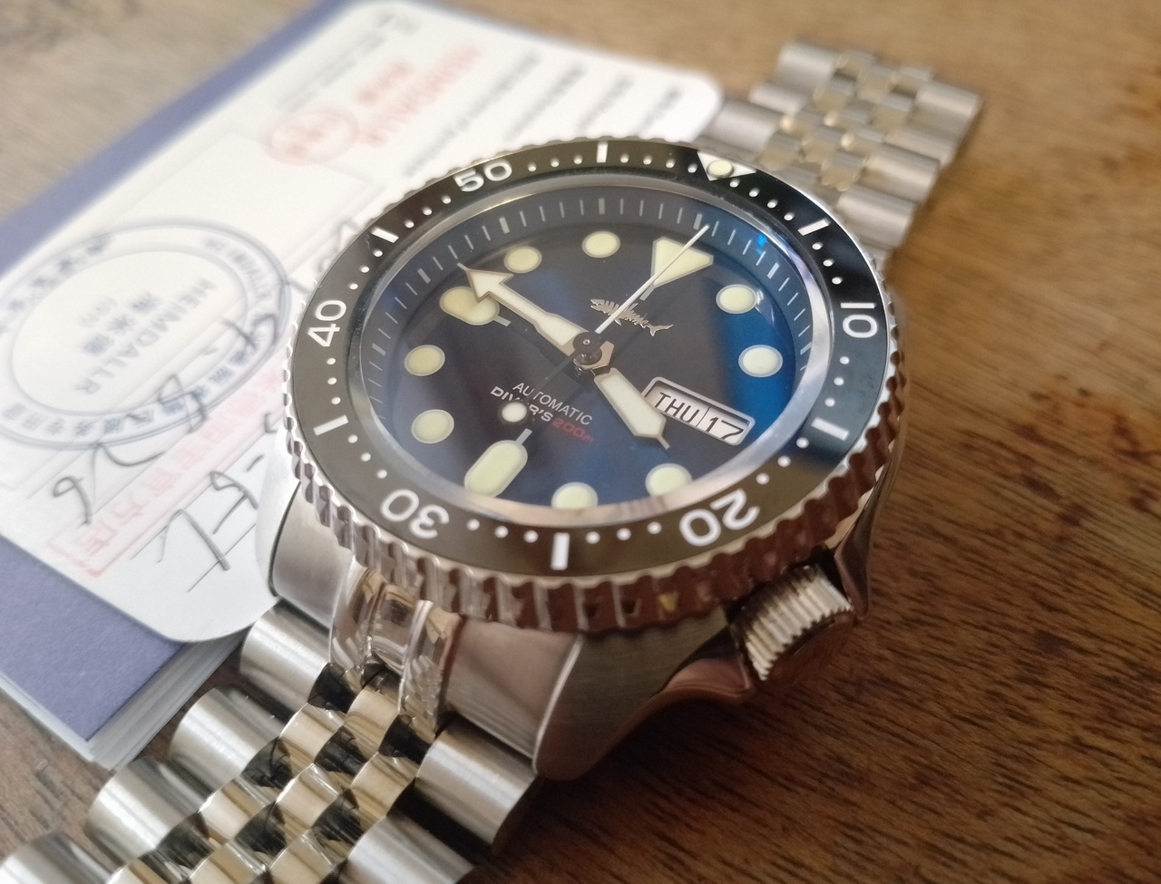 Приехали ко мне часики, хомаж на Seiko SKX007 от HeimDallr. Очень понравились, как и ожидалось - качество на высоте, заказал опять от HeimDallr, потому что у меня уже есть часы от этого китайского бренда (хомаж на Seiko Monstr v3 в бардово-рубиновом варианте). Исполнение очень понравилось, качество отличное, цвет циферблата - это просто нечно неописуемое, на фотографиях у продавца он смотрится как чёрный, хотя заявлен как синий, на самом деле, в живую, он почти чёрный с очень глубоким отливом в тёмно-тёмно синий (чернильный), я бы сказал - цвет ночного океана - класс! Я как раз не хотел синий, а хотел почти чёрный, так и есть. То ли это играет антибликовое тёмно-синее покрытие стекла, то ли циферблат имеет такой классный оттенок. Сапфировое стекло имеет небольшую фаску по краю, что придаёт дополнительного шарма, метки чуть преломляются при некоторых ракурсах. Взял специально на юбилейном браслете, никогда не было у меня такого, а обычный трёхзвенный ойстер как-то уже поднадоел. Снял четыре звена, в комплекте станочек и мини-вилочка для снятия шпилек, талончик гарантийный и книжка-мануал. Коробка сама добротная. Вообще, у HeimDallr традиционно - отличная комплектация и упаковка, определённо могу сказать, что это теперь один из моих любимых микро-брендов. Отделка по корпусу очень аккуратная, стекло - сапфир, безель имеет керамическую вставку и левостороннюю трещётку на 120 кликов, причём вращение очень приятное на слух с характерным сдвоенным щелчком, очень классное! Заводная головка большая, ухватистая и имеет очень большое количество витков, что здорово! Юбилейный, пятисоставной браслет выглядит довольно просто, но я от него и не ждал каких-то чудес особенных, застёгивается, удобный, да и ладно; укорачивается легко, в комплекте станочек для выталкивания межзвенных шпилек. Люм заявлен C3 швейцарская люминова, по факту, она и есть, светится очень сильно от кратковременного засвечивания любым источником света, как долго будет светиться, не знаю, кому интересно, могу отписаться завтра. Давно хотел этот вариант дайвера хомаж на SKX007, необычные стрелки, большие круглые метки, отличная читаемость! Долго изучал тему рождения SKX007 от самых первых дайверов Сейко 62MAS и до Seiko 5, дизайны на столько похожи, что не понятно, собственно, на какую модель это хомаж, то ли на SKX007, то ли на Seiko 5, но получилось классно. Длиннющая секундная стрелка с точкой-противовесом очень эффектно смотрится. Часы не тяжёлые, видимо, отчасти из-за юбилейного лёгкого браслета. Что могу сказать: приятно держать в руках, приятно на них смотреть, приятно их носить, реально получаю удовольствие от использования! Могу снять видео, если кому надо. Короче - рекомендую. В плане цены, средняя цена на известной площадке варьируется от 12 до 16 т.р. Мне удалось ухватить за 11800р. по акции!