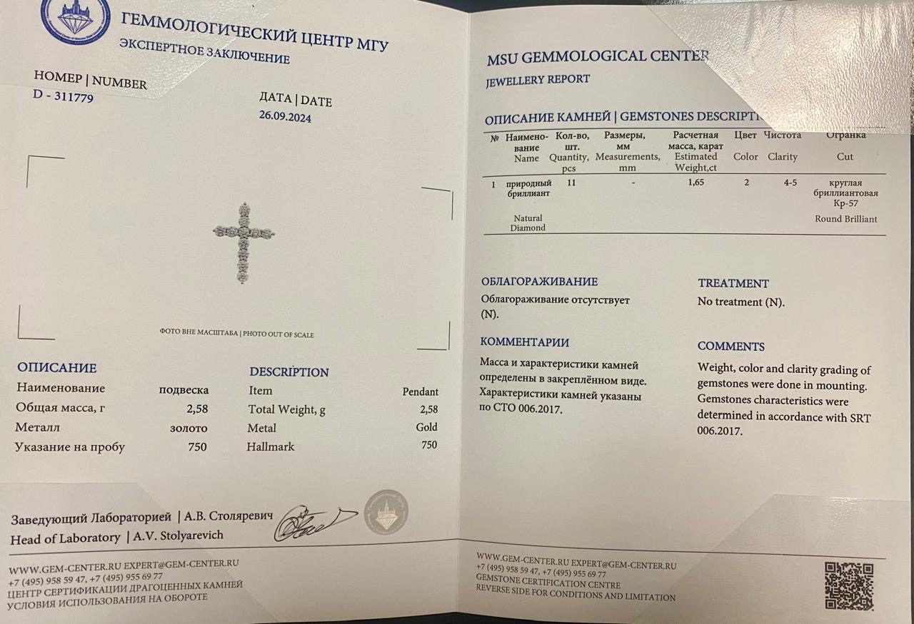ПОДВЕСКА "КРЕСТ С БРИЛЛИАНТАМИ", 1,65 карат (аттестат МГУ)!
