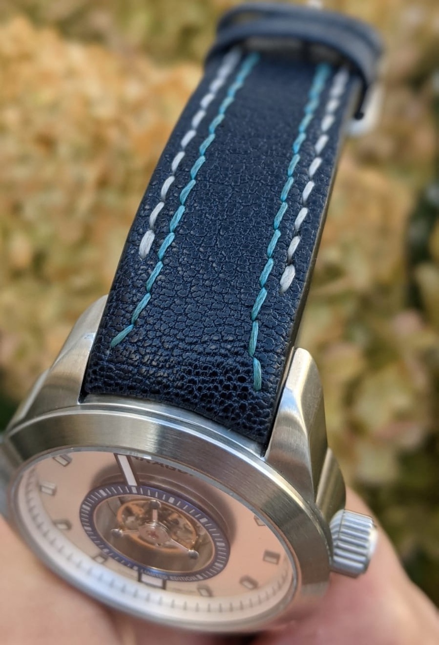 Надо сказать, что всю радость владения я ощутил, когда пересадил часы на специально сделанный для них ремень, который подчеркнул всю их красоту и придал часам лоск и шик. Ремень я шил у своего мастера, который постарался повторить форму каучука, сделав его жестким у ушек и мягким в зоне отверстий.