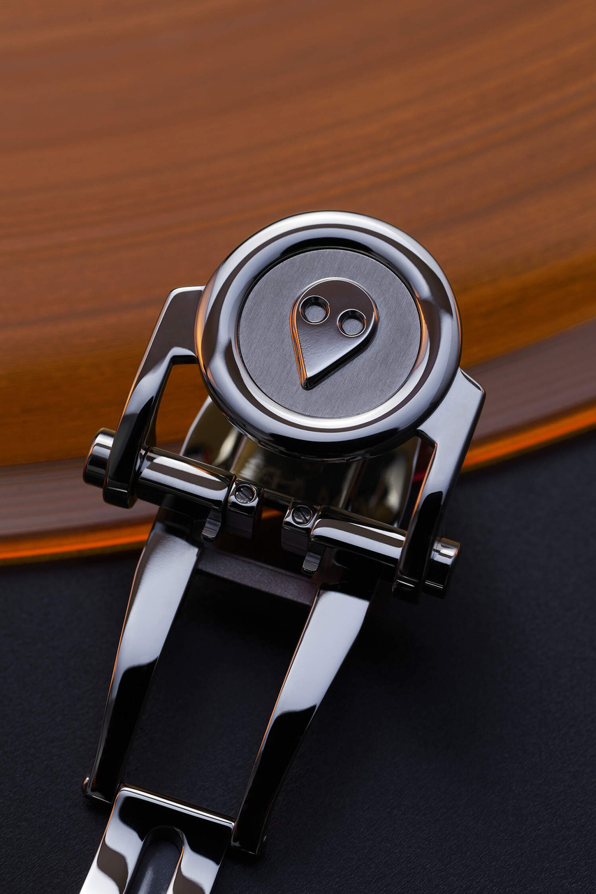 Размещенные по центру M.A.D.2 рельефные индикаторы часов и минут напоминают вертушки диджейского пульта. Центральный циферблат, на котором они вращаются – выполненная со вкусом аллюзия на текстуру винила, с бороздками и сатинированной отделкой, имитирующей звуковые дорожки. Циферблат окружен диском, воспроизводящим стробоскопическую полосу проигрывателя Technics SL-1200, который дополняют стопорные штифты с покрытием Super-LumiNova. При каждом движении запястья диск вращается и, если прислушаться, можно услышать, как в нем пульсирует ритм прошлого. Стробоскопический диск в действительности является ротором автоподзавода, который виден как с лицевой, так и с обратной стороны часов. Перевернув часы, вы сможете детально рассмотреть этот гироскопический ротор со смещенным центром вращения, при виде которого вы невольно покрутите головой.
