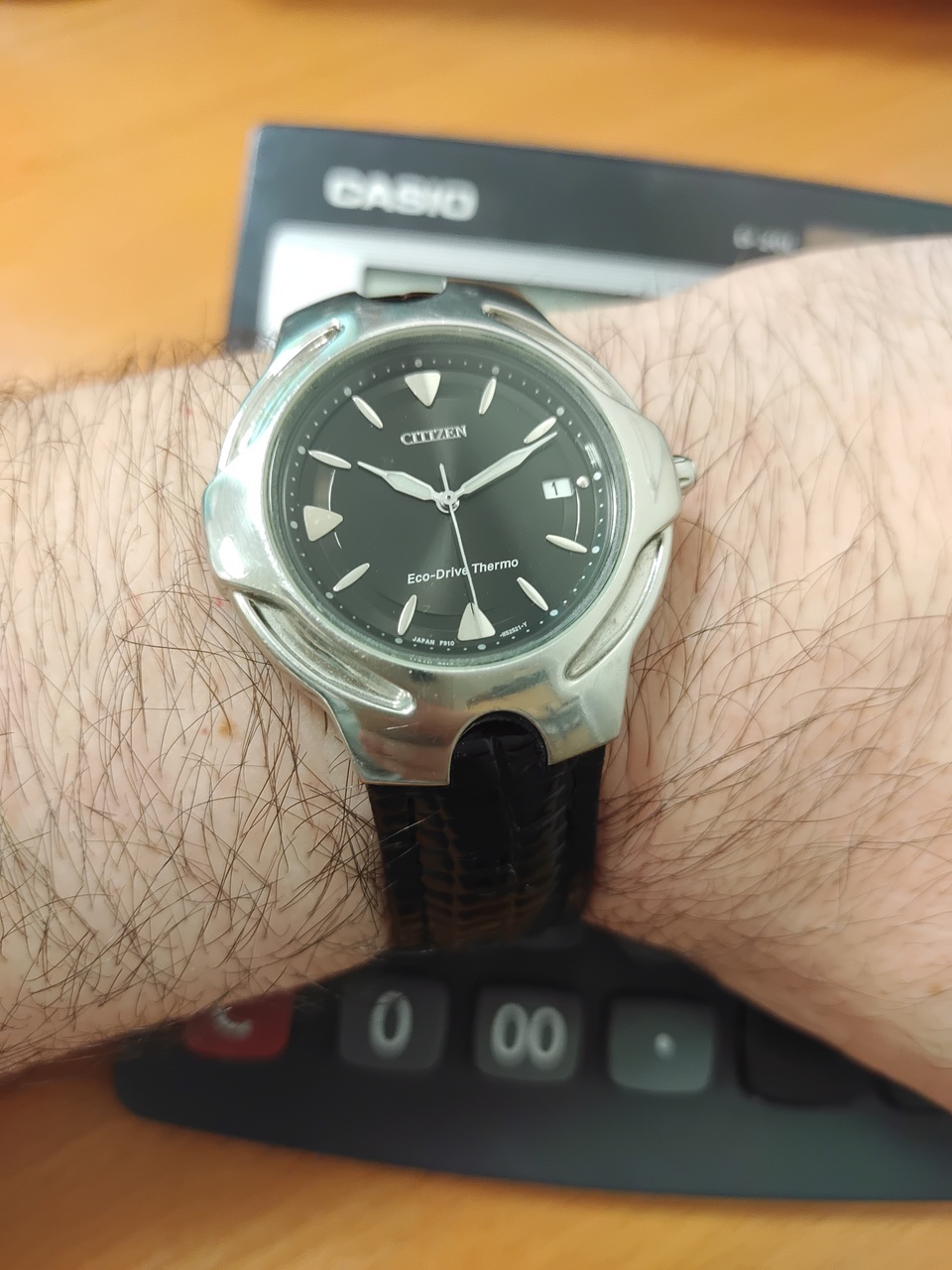 Citizen Eco-Drive Thermo BQ1000-69E пересадил с синего "крокодила"на чёрную лаковую "ящерицу". Мне кажется неплохо?