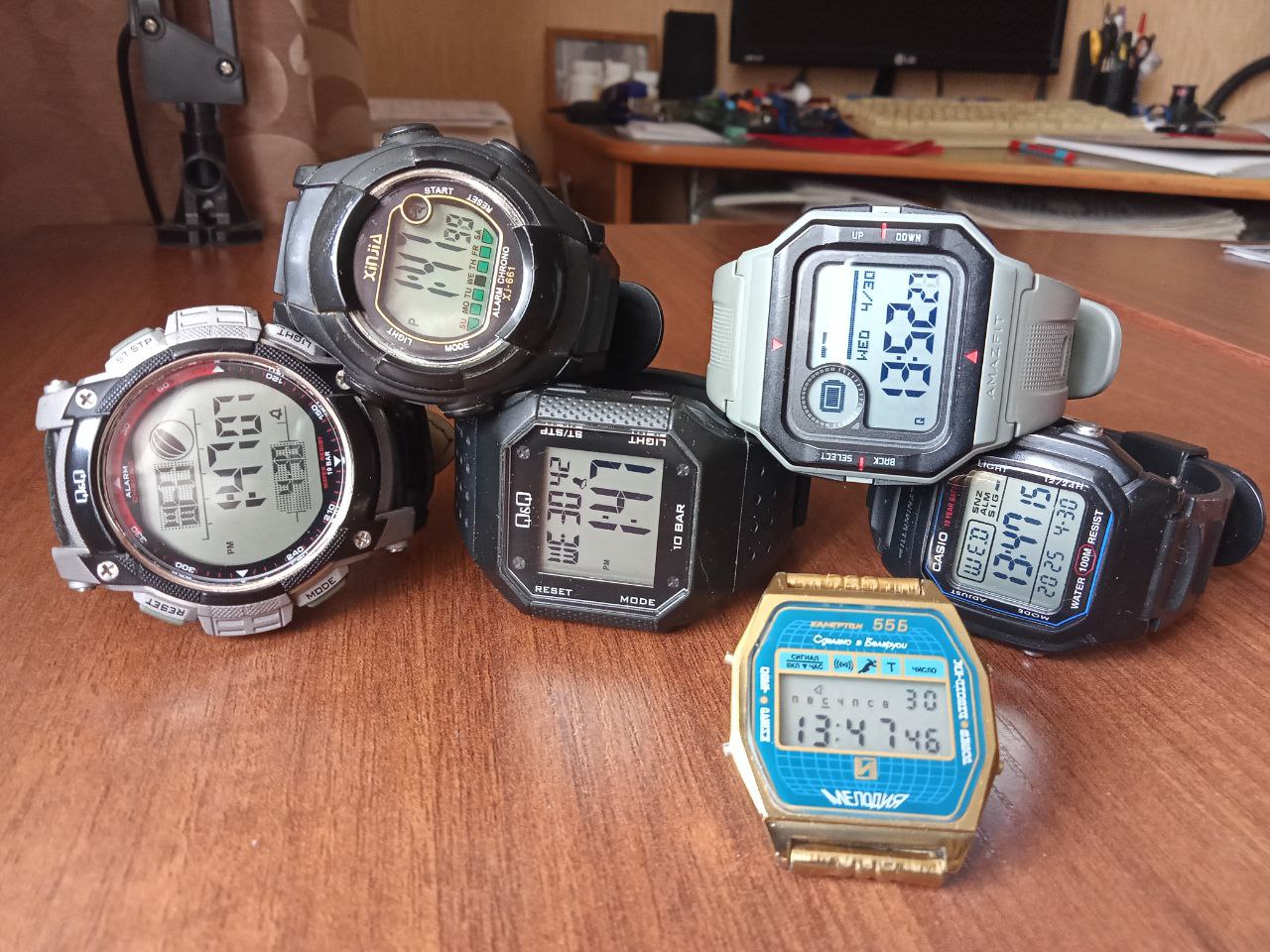 Q&Q M119, Q&Q M158, Casio W-800H, Amazfit Neo, Xinjia, Камертон 55Б (мелодия). Вот последние "Камертоны" сейчас и ношу как наиболее ностальгически аутентичные моей молодости ))) Зрение, конечно, уже не то. Но в течение солнечного дня, особенно на улице - все вижу прекрасно. )))