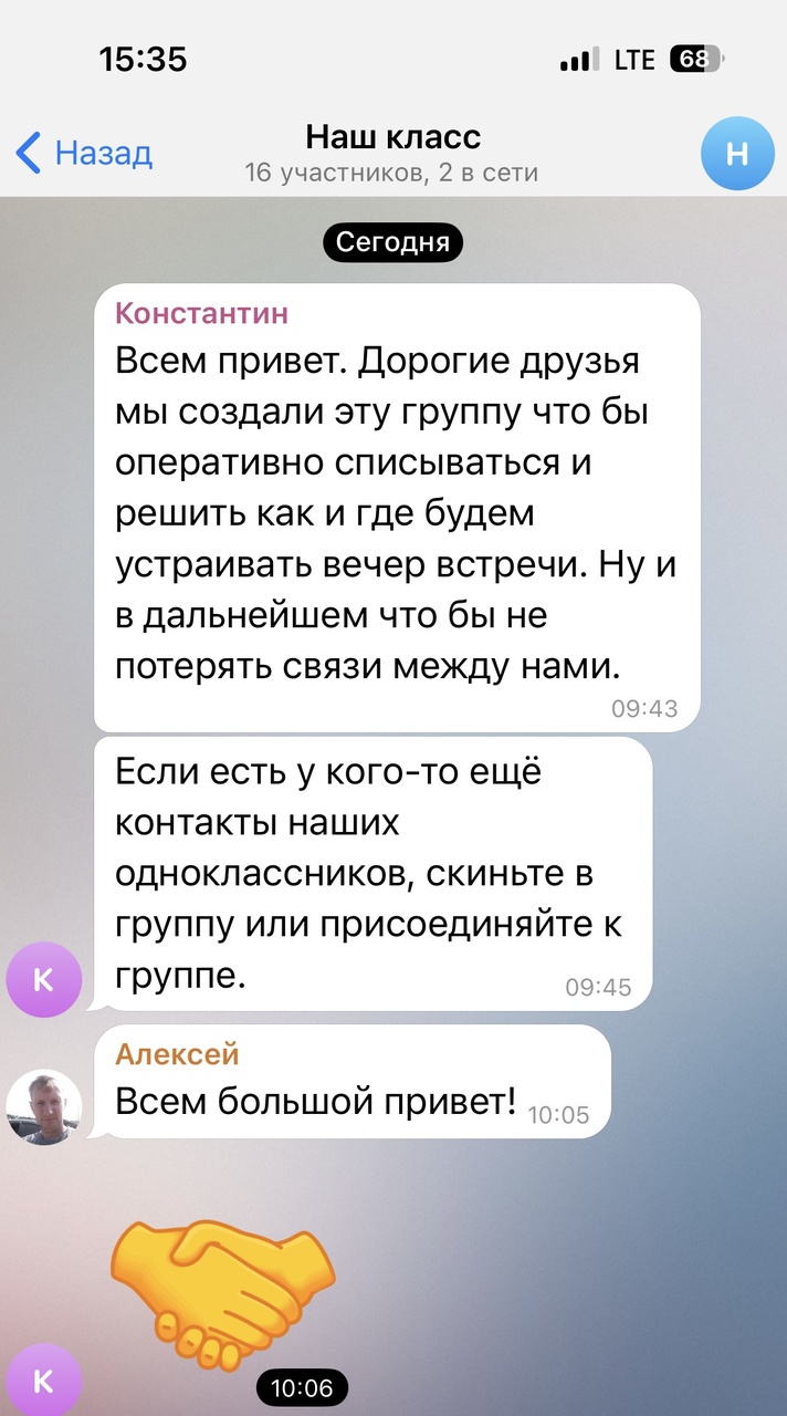сегодня бывший одноклассник, приятель, редко крайне видимся, от случая к случаю, предложил присоединиться. группу в телеге запилили, наш класс обозвали, там и те, кто до 8го был, и те, кто по 10й. пока 16 человек набралось из 30ти с небольшим учеников, "а" класса. не все дожили, а кого искать окольными путями.