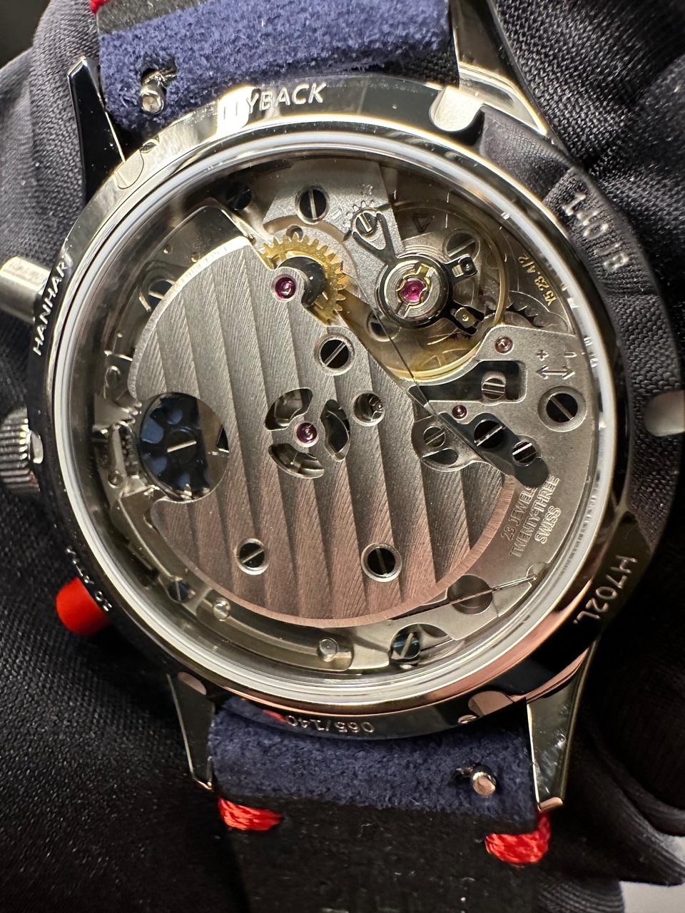 В секундомере, который также, как и часы, оснащен функцией Flayback, установлен собственный механизм Hanhart — caliber 122, стекло секундомера пластиковое.
