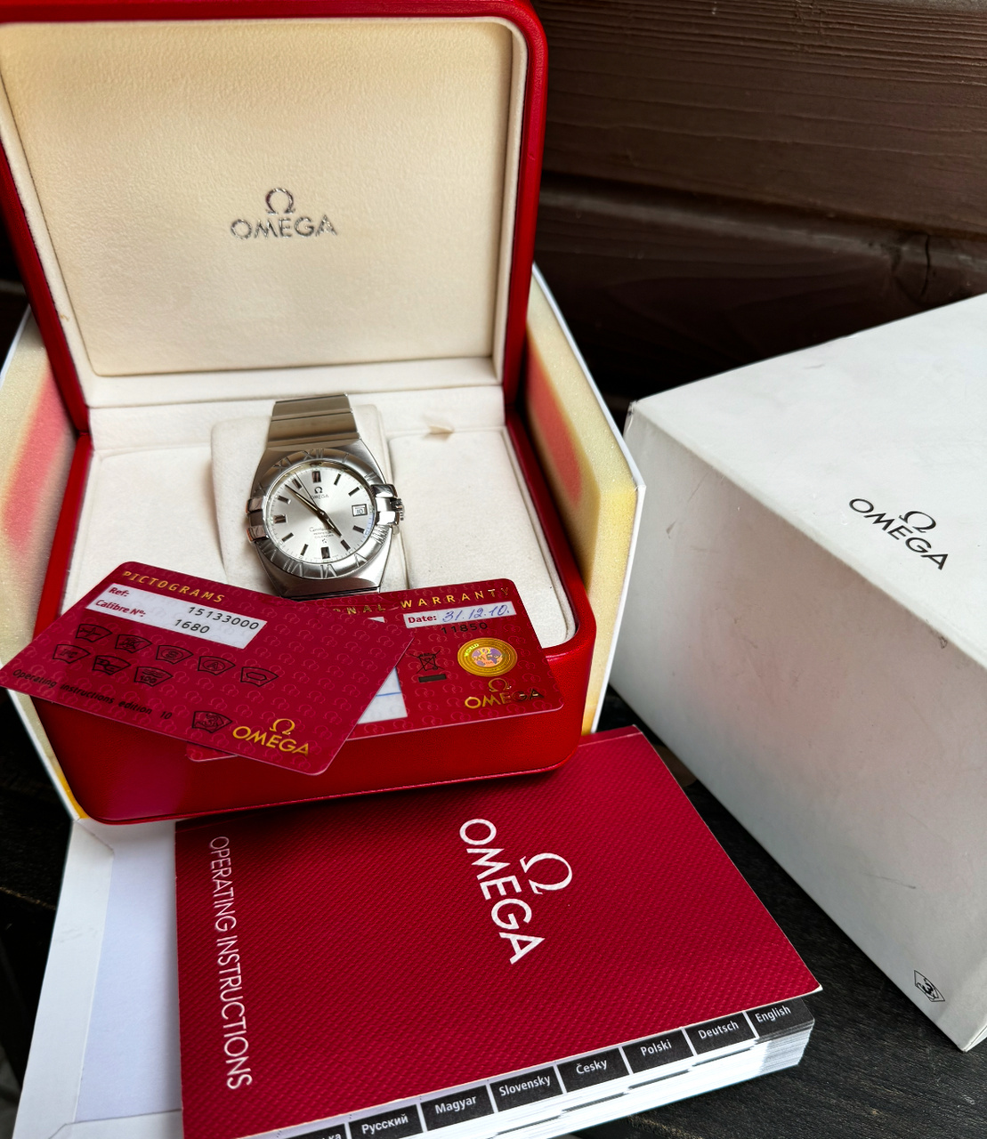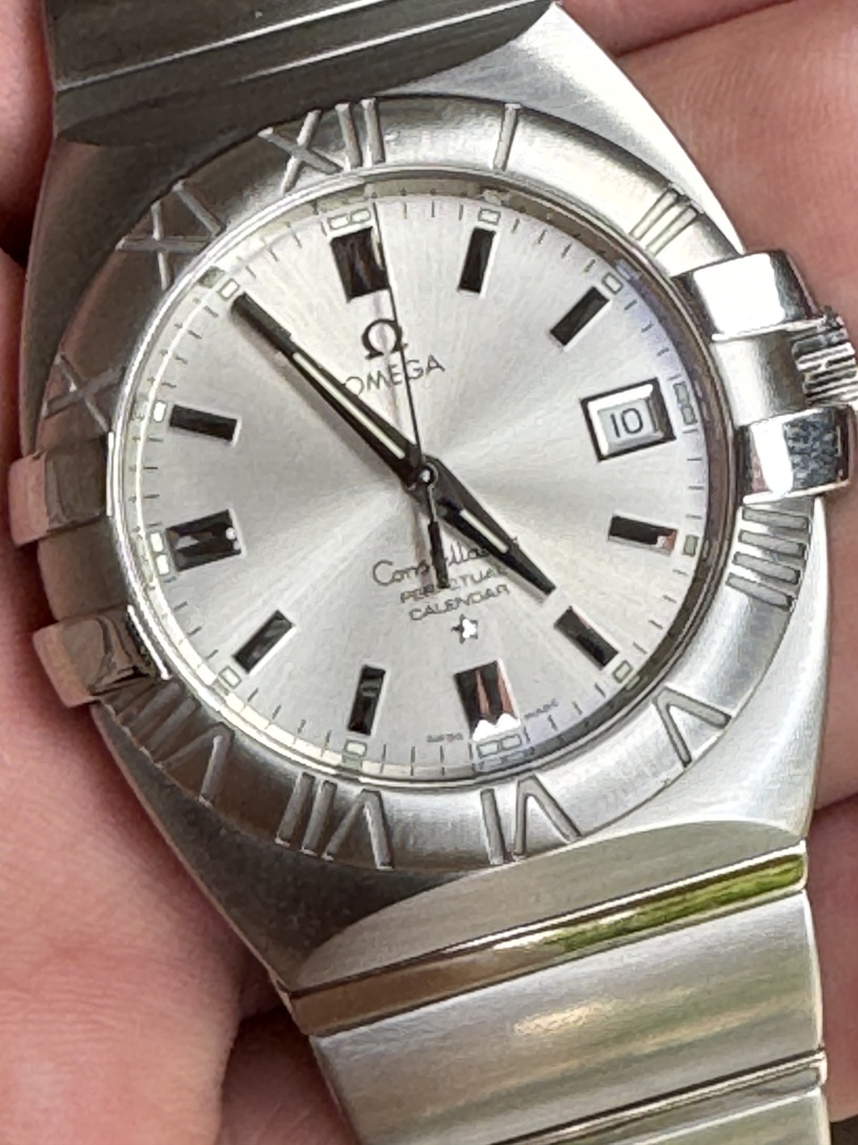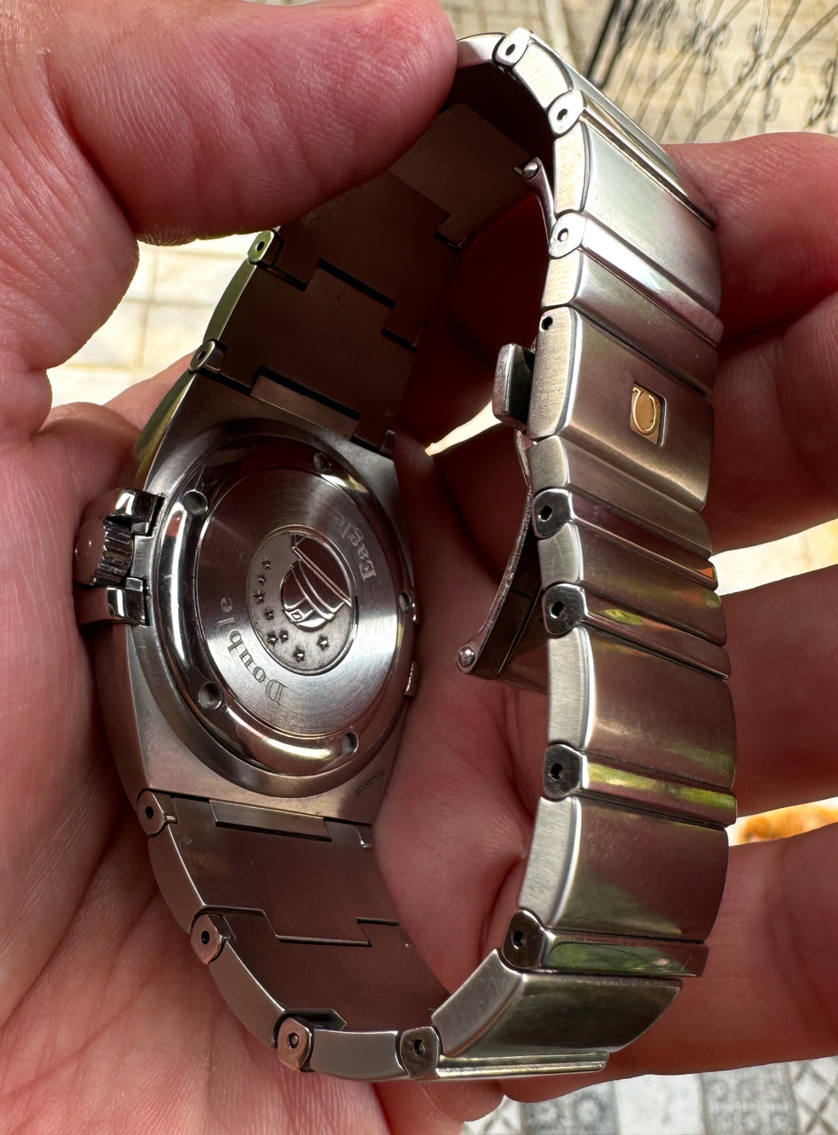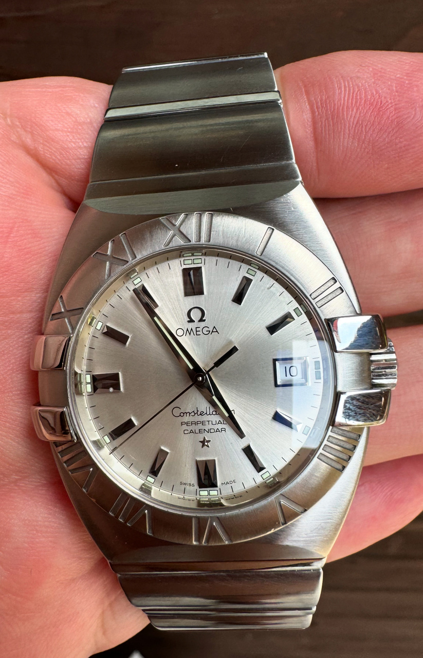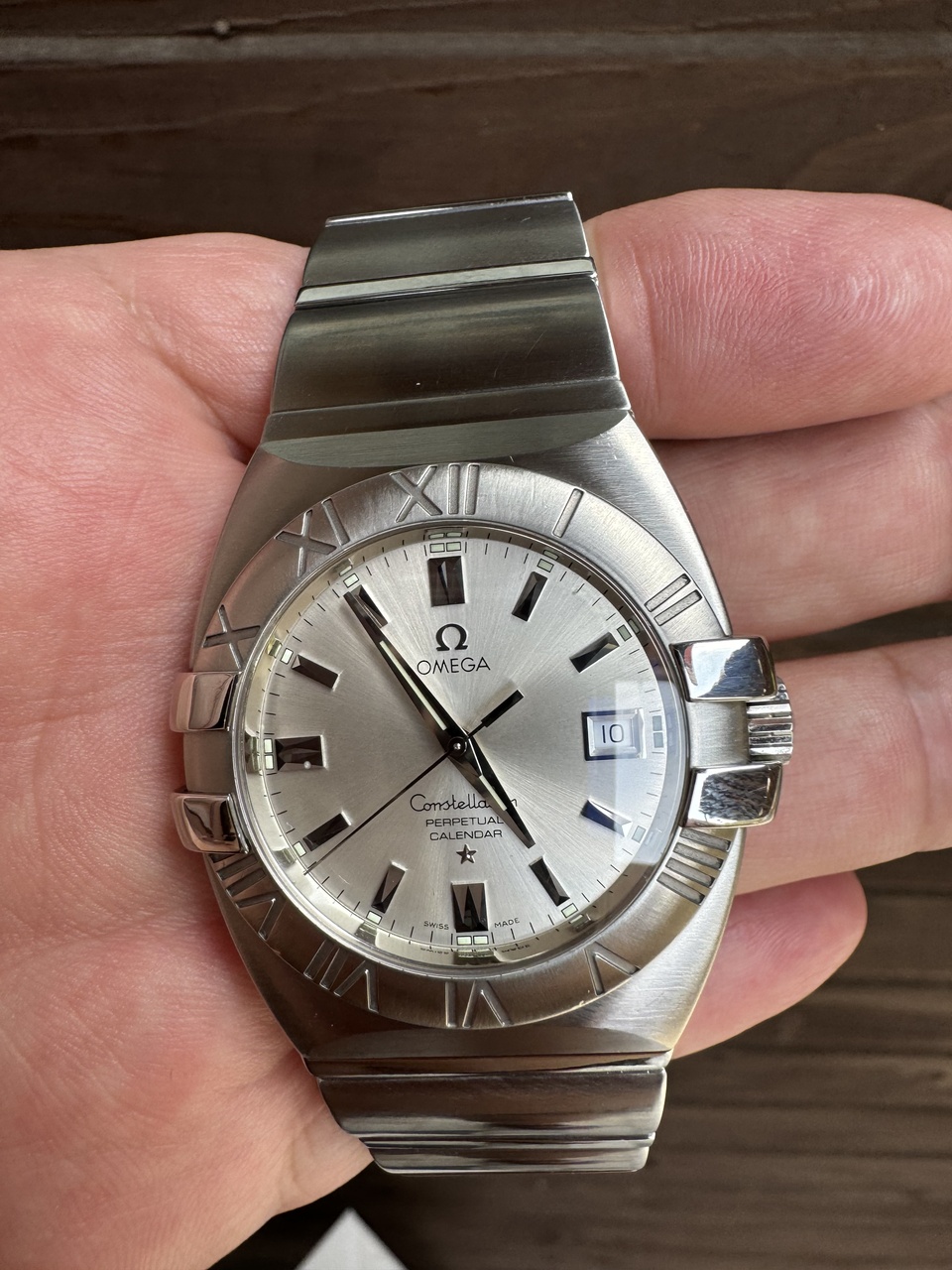 В продаже редкие Omega Constellation Double Eagle Perpetual, реф. 1513.30.00, уже коллекционные часы с вечным календарем, на полном комплекте в минтовом сохране, именно в размере 38 мм, это строго по корпусу, за счет "крыльев" - все 41 мм, смотрятся крупно, именно по мужски, за счет анатомической формы браслета ловко сидят на руке, сталь, сапфир, WR - 100M, часы не полировались, отличнейший сохран, документы, книжки, коробки - все есть, браслет на руку 19 см