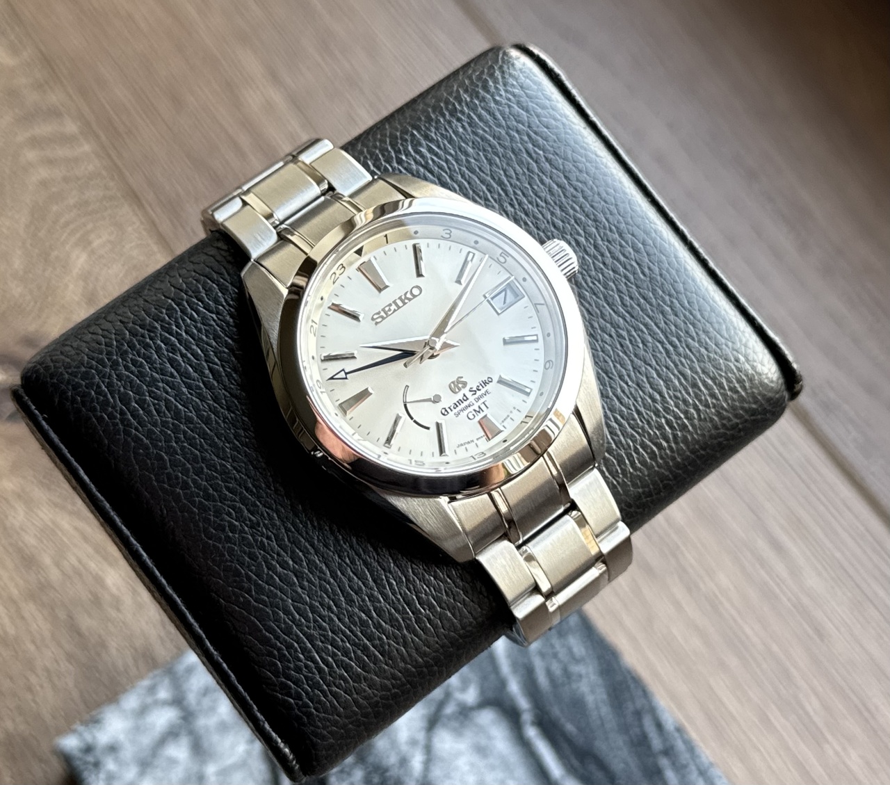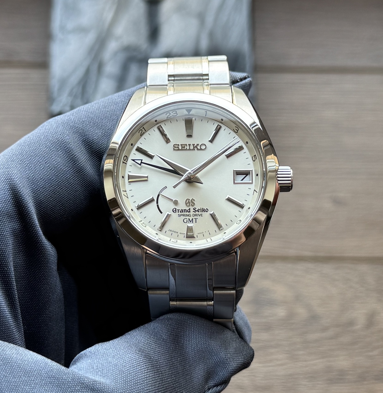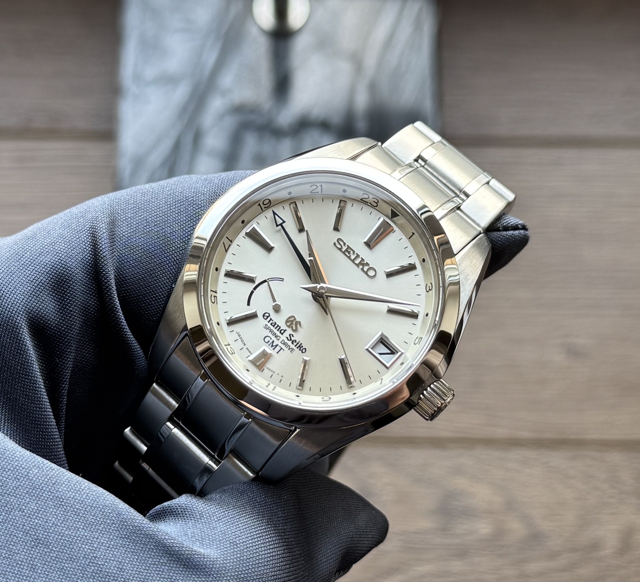 В продаже шикарный Grand Seiko с циферблатом цвета шампань, идеально полированным стрелками и метками, в корпусе из нержавеющей стали. За работу отвечает знаменитый механизм Spring Drive с гипнотическим эффектом от плавного хода секундной стрелки, калибр 9R66 с функцией GMT и запасом хода до 72 часов.