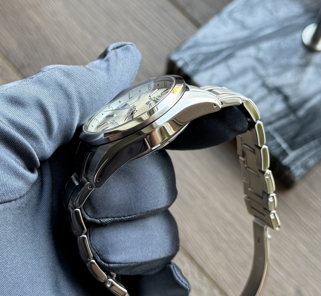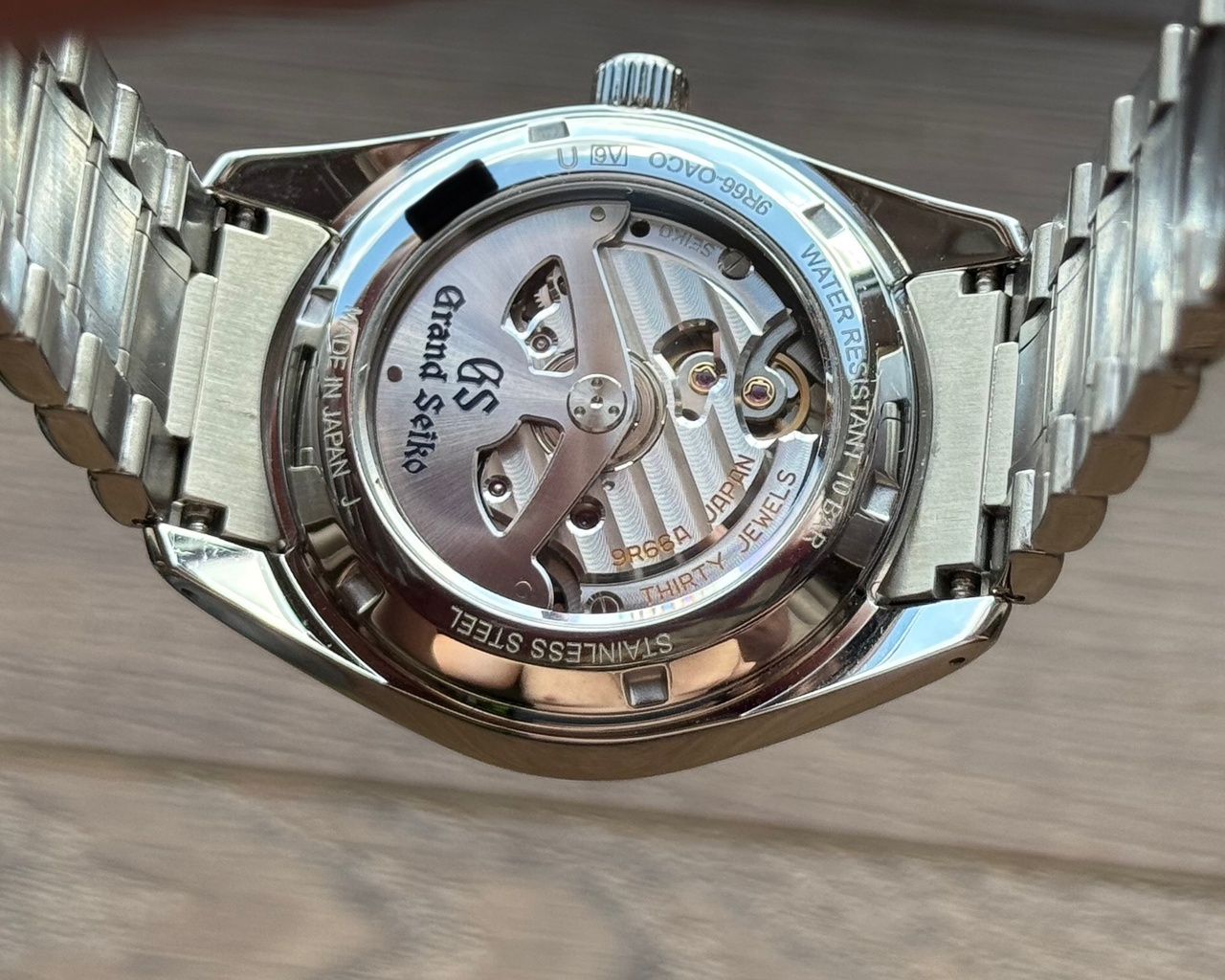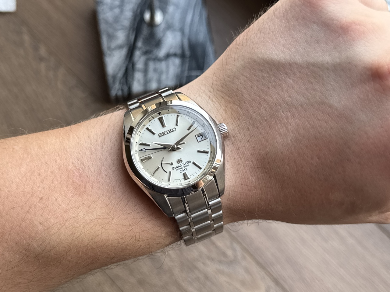 В продаже шикарный Grand Seiko с циферблатом цвета шампань, идеально полированным стрелками и метками, в корпусе из нержавеющей стали. За работу отвечает знаменитый механизм Spring Drive с гипнотическим эффектом от плавного хода секундной стрелки, калибр 9R66 с функцией GMT и запасом хода до 72 часов.