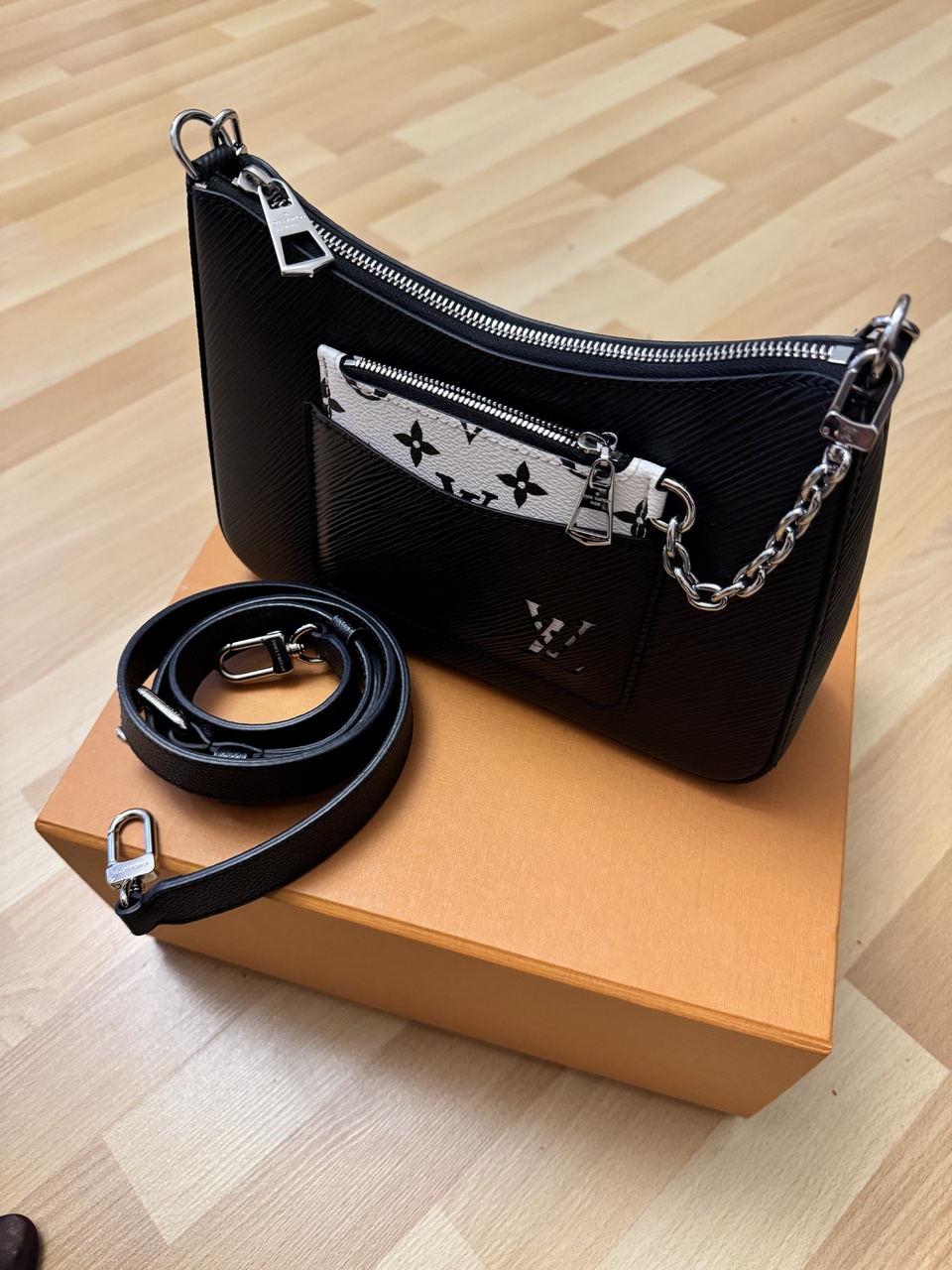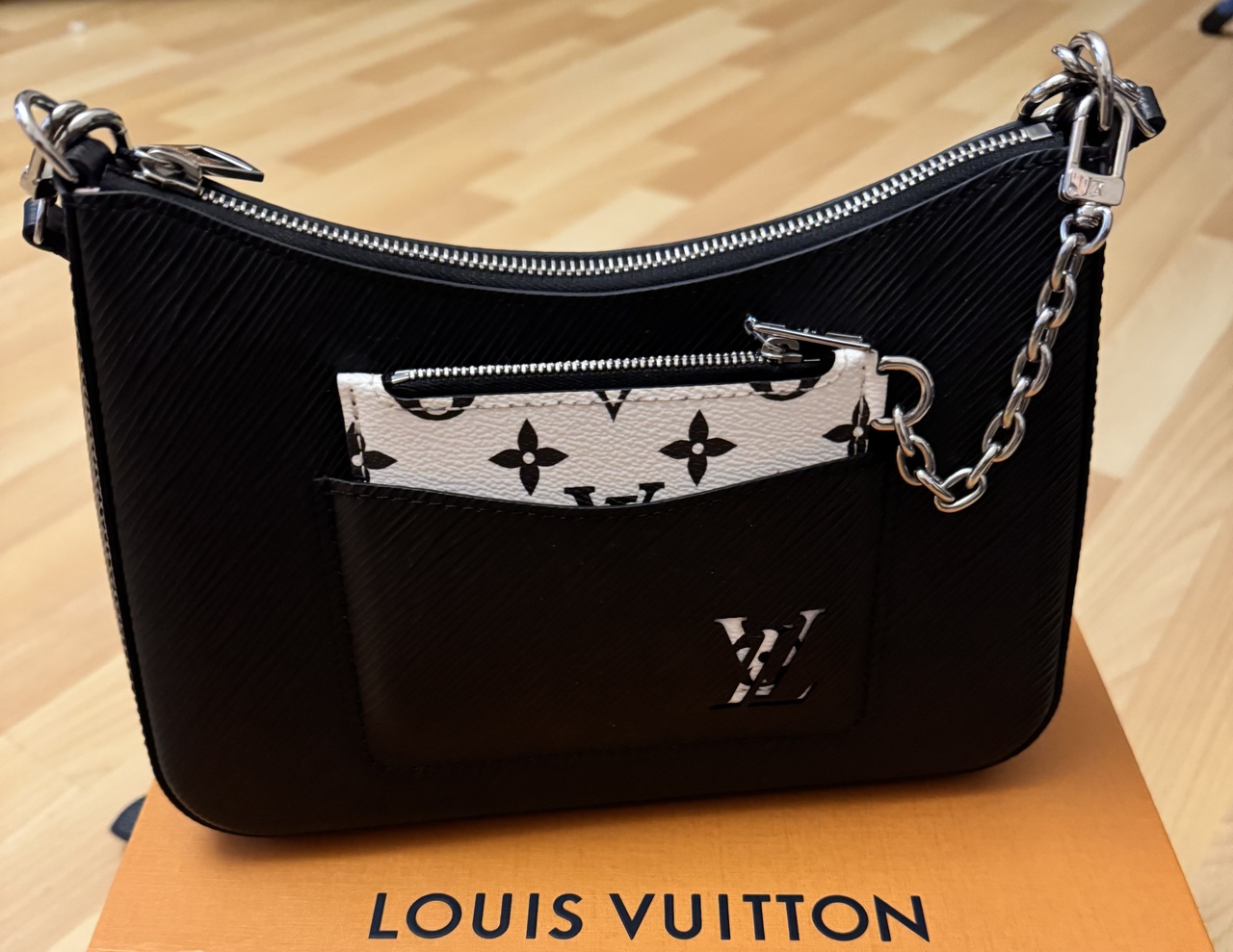 Сумка Marelle изготовлена из зернистой кожи Epi и оснащена съемным холщовым мешочком, который помещается во внешний карман и крепится к сумке с помощью цепочки. Сумку Marelle можно носить в руке, на локте или на плече благодаря съемной верхней ручке или через плечо благодаря съемному регулируемому кожаному ремню.