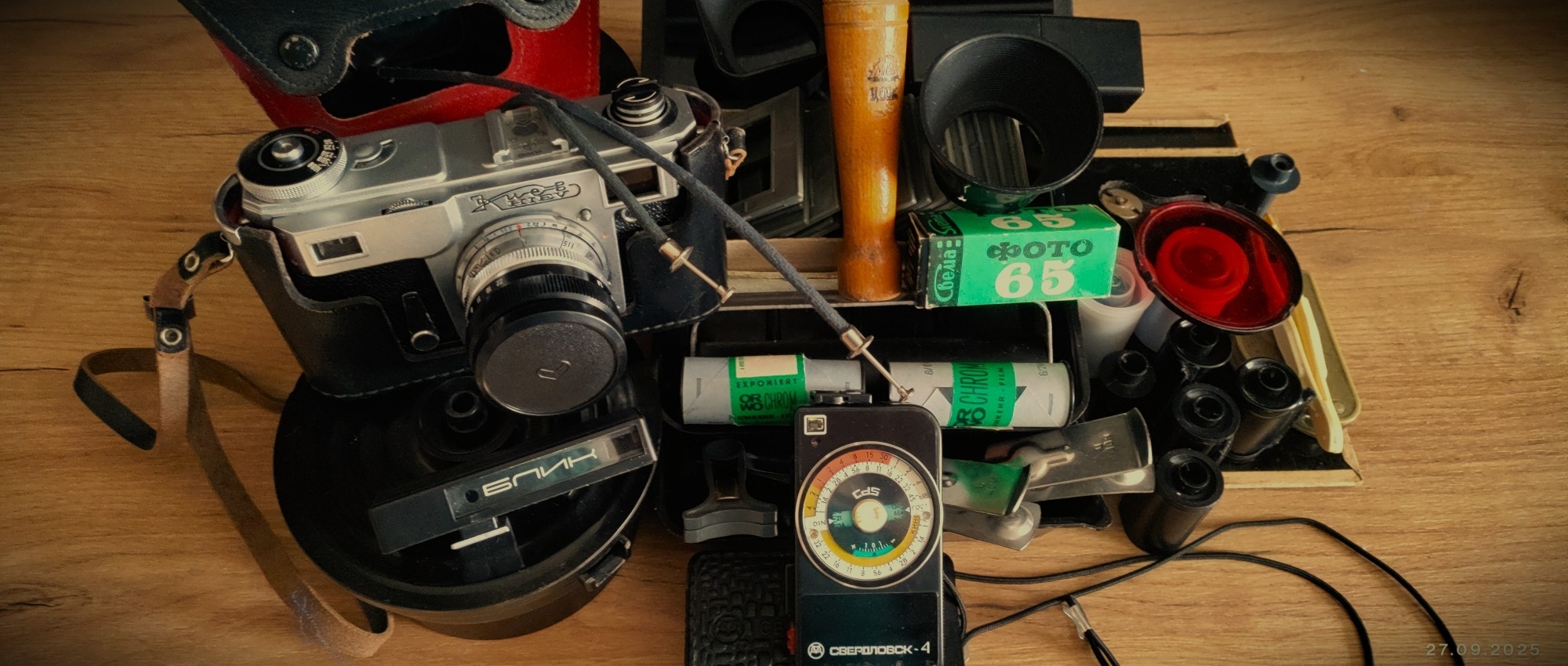 А у меня вот ничего не сохранилось. Когда случилась цифровая революция (а произошло это очень быстро, буквально молниеносно!) просто собрал всё, относящееся к плёночному фото, и отнёс в комиссионный магазин. Решил, что не стоит всё это хранить исключительно ради ностальгии, а момент, когда за данный товар можно выручить неплохие деньги, будет упущен буквально через несколько месяцев. Так и случилось. Выручил неплохие деньги, а через год всё это практически ничего не стоило. На дворе был 2004-й...