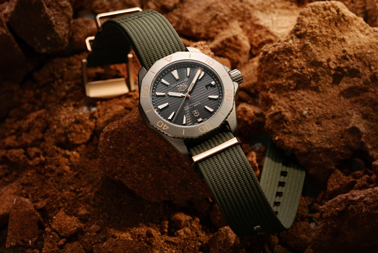 Модель, которая «черпает вдохновение в ландшафте австралийской пустыни», изготовлена из титана, а метки на безеле, стрелки и индексы на циферблате покрыты 18-каратным розовым золотом. В свою очередь, титановая фурнитура комплектного зеленого ремешка «в рубчик», получила золотистое PVD-покрытие.