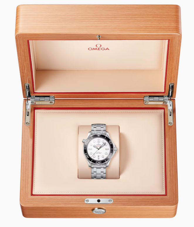 Цвет циферблата: Из белой керамики с полировкой. Выгравированным лазером знаменитый волнообразный узор, характерный для моделей 300M. Аппликация часовых индексов и стрелки декорированных в технике “чернение”. Люминесцентный состав Super-LumiNova белого цвета.