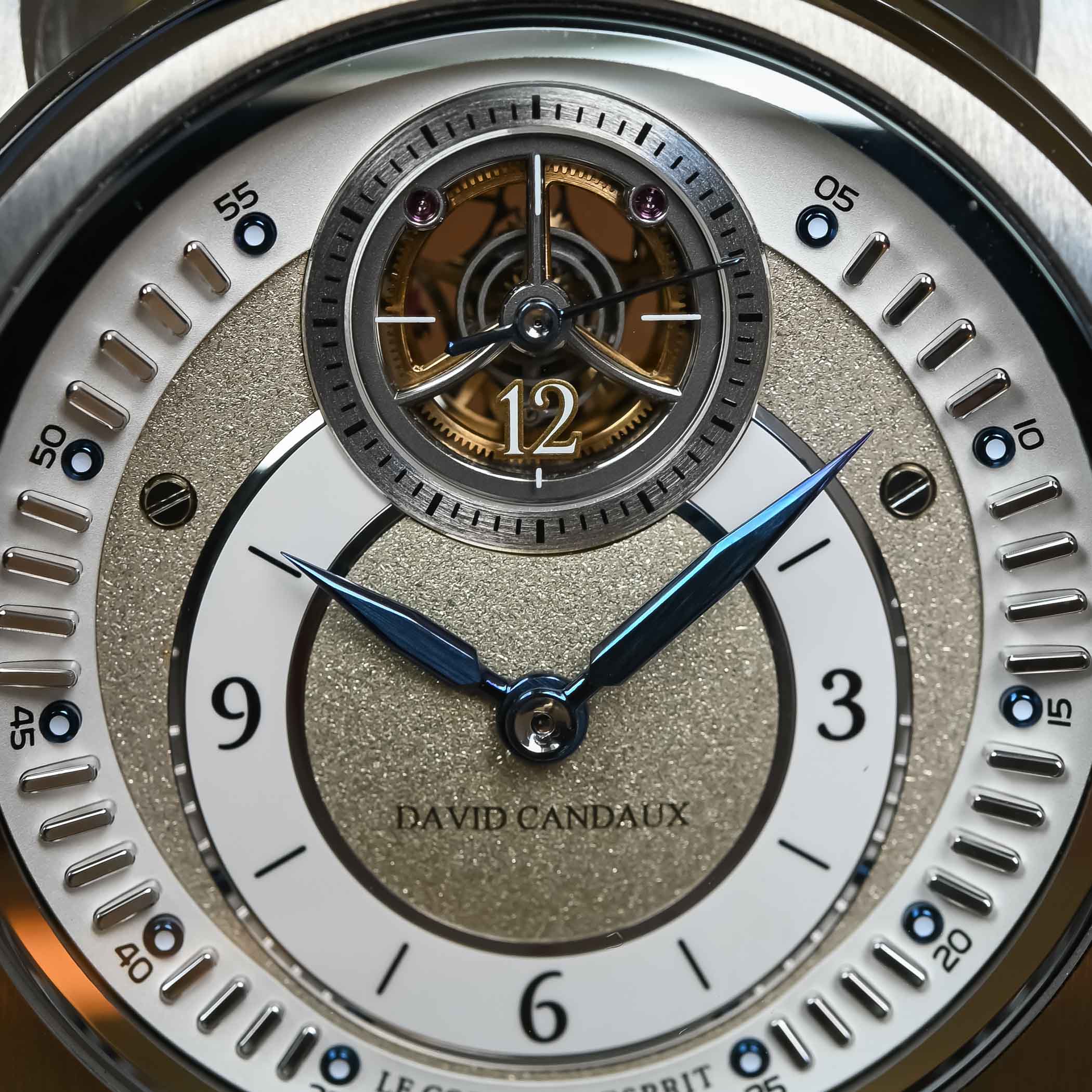 Механизм: калибр C30 с ручным заводом, разработан и собран Дэвидом Кандо в Ле-Соллиа – три патента – 29,5 мм x 6,9 мм – 258 компонентов, включая 45 драгоценных камней - двойной регулятор с двумя собственными балансирами с переменной инерцией диаметром 10 мм с золотыми винтами среднего времени и крестообразной концевой кривой - 21 600 колебаний в час - Планетарный спутник в положении "12 часов" - ювелирный подшипник - 60 секундный оборот – хронометрический запас хода 58 часов – два соосных, последовательно соединенных быстро вращающихся барабана с пружинами с фиксированным фланцем – перемычки и основная пластина из титана с прямой зернистостью , отполированные вручную скосы и углы, внутренние углы, перламутровые вставки под перемычками - часы, минуты, малые секунды.