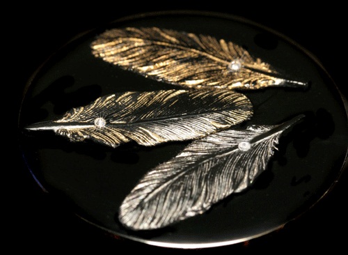 Можно только подивиться, как искусно выполнены три пера, каждое из которых украшено бриллиантом. Выгравированные на черном циферблате, они были сначала покрыты лаком, потом отполированы специальной японской бумагой, после чего посыпаны порошком из красного или желтого золота и платины и в завершение еще раз разглажены бумагой.