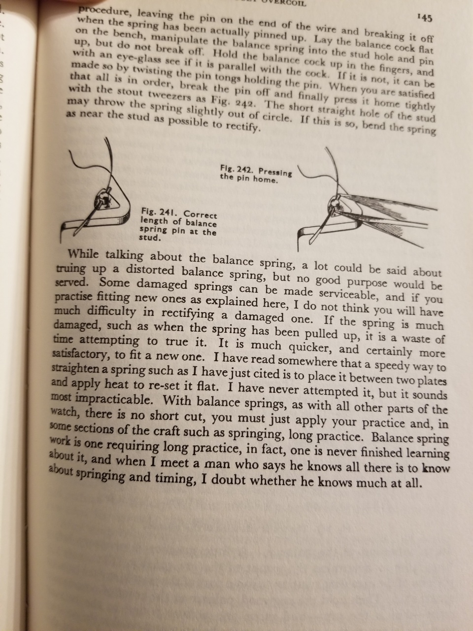 Вообще, эта книга Харитончука мне сильно напоминает книгу Дональда де Карле "Practical Watch Repairing", как общей организацией, так и текстом и картинками. Она явно использовалась в качестве подручного материала. Однако, ДдК похоже довольно скептически относился к правке пружины баланса. По его словам, некоторые пружины можно сделать пригодными, но при значительных дефектах, попытки их исправить - это потеря времени. Проще подобрать новую.