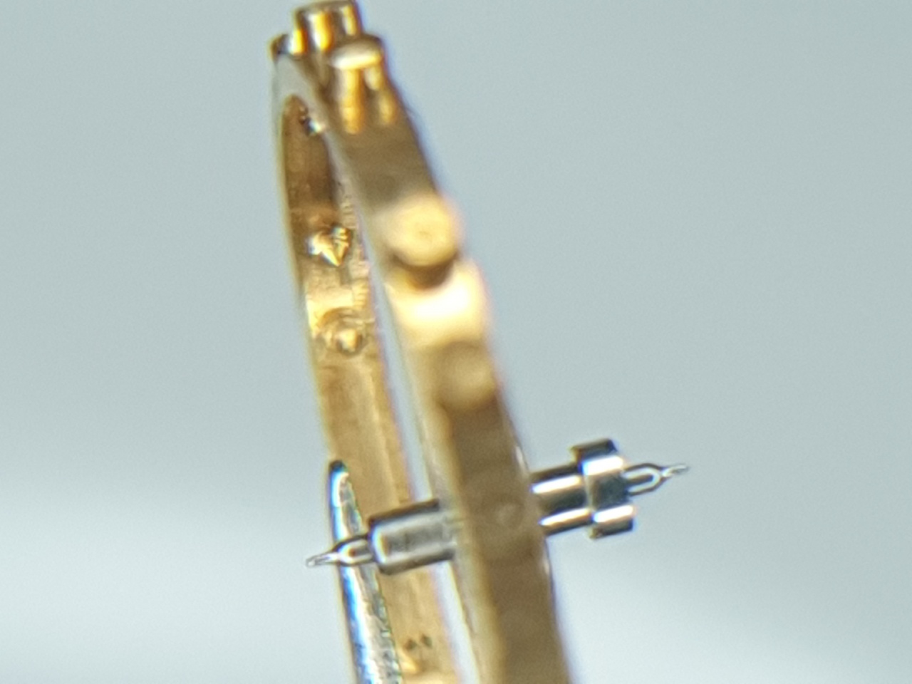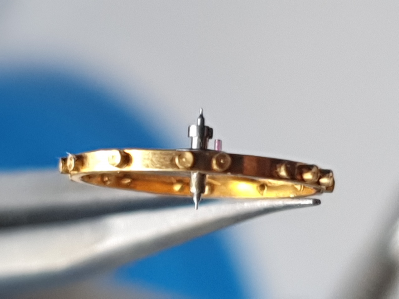 Как поставить спираль на балансе, чтобы импульсный камень попался на месте (выкачка была правильной)? Посмотрите на фотографии баланса до снимания спирали, и все будет ясно. Простой способ - поставьте баланс без спиралю в механизм, с мостом. Поверните баланс так, что имп. камень установил вилку по середине между щифтами. В таком положении поставьте отметку маркером на ободе точно навстречу отверстия для колонки спирали в мост. Потом поставить спираль нужно так, чтобы колонка была навстречу отметки.