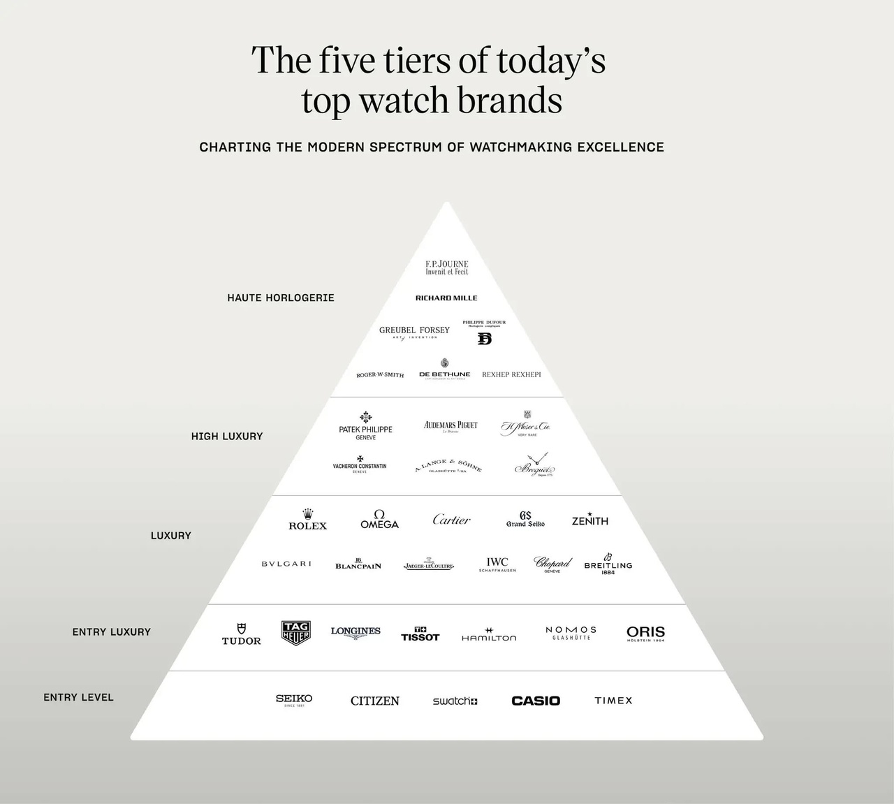 В конце 2025 года, Тедди Балдассарре выпустил интересную статью и актуальную (five tiers of today's) таблицу-пирамиду по часовым брендам.