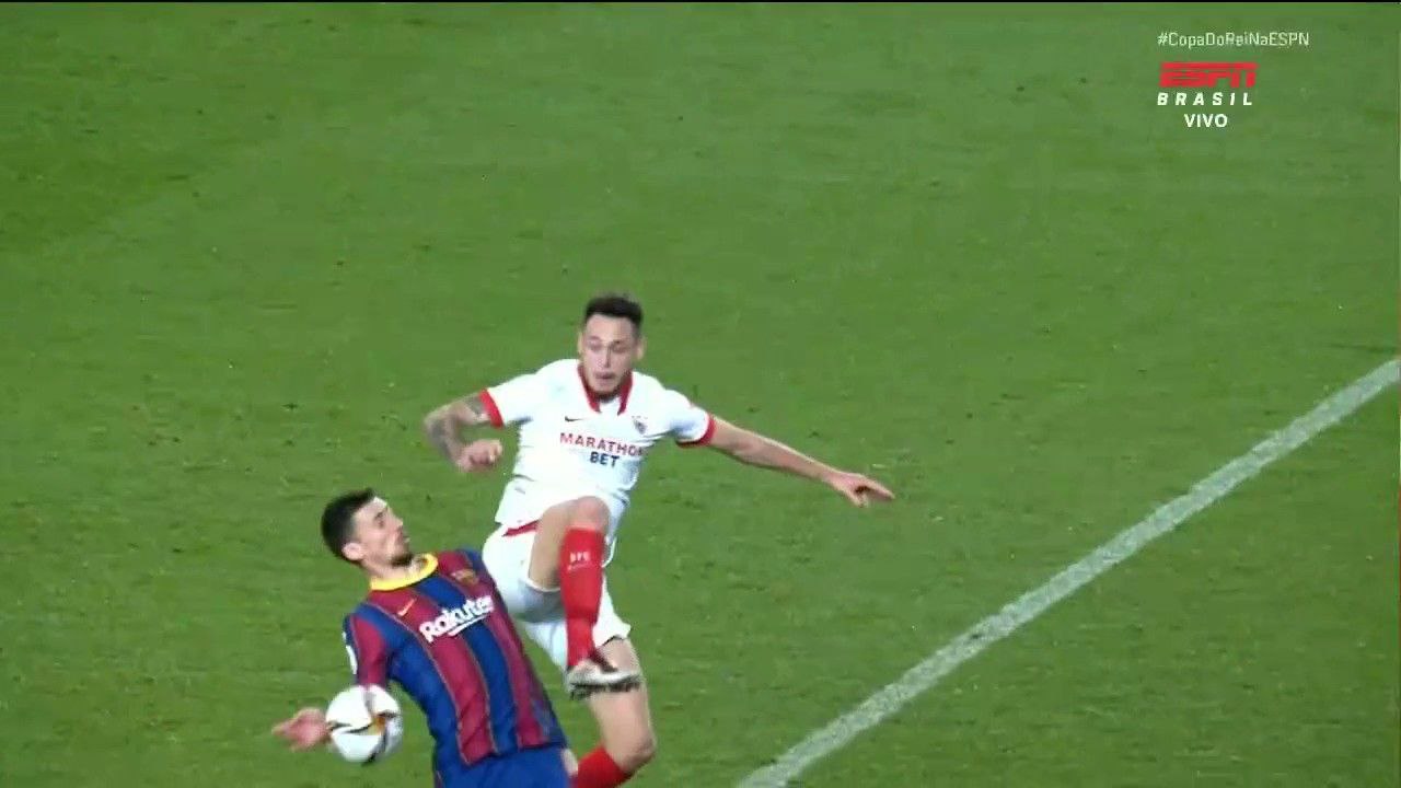 Вот момент из матча Барсы и Севильи. Мяч попадает в грудь Лангле, а потом отскакивает в руку. Тут - пенальти нет.
