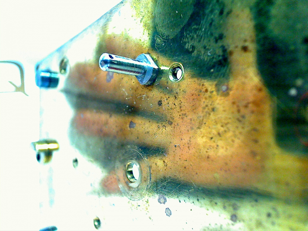 Вот, показываю - подобная замызганная была платина. Грязь вся сама стекает - две минуты, долго не держать, и под проточную воду, хорошенько ополоснуть и феном просушить. Как видим - бронза горит, болтики синенькие, оси блестят как новые а с серого металла ржавый налёт исчез.