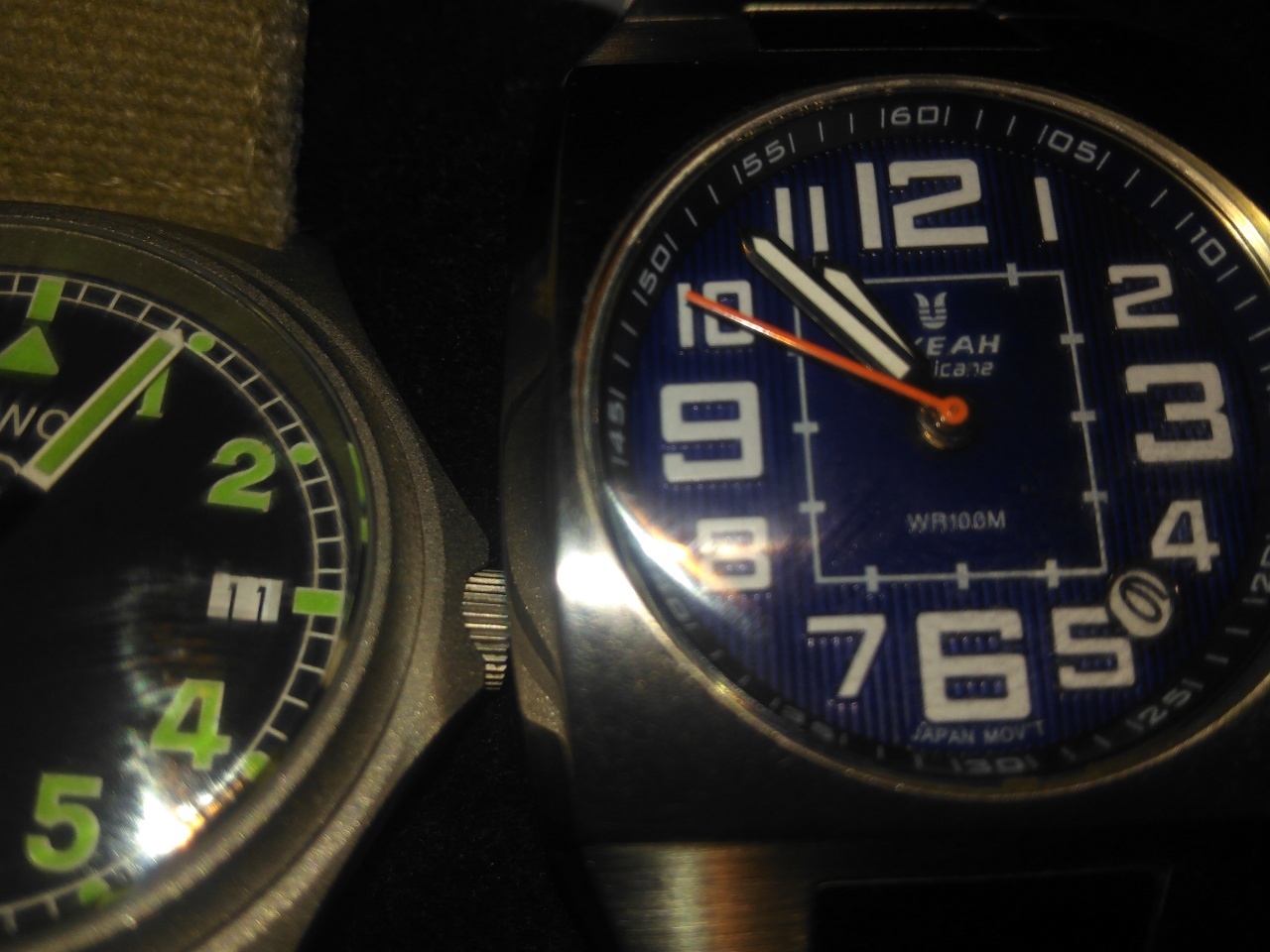 Итак, для любителей сказок о китайском люме и рекламных фото. На первой картинке слева часы со швейцарским суперлюмом, справа с китайским толстым слоем и большой площадью. Вторая картинка- фото после засветки телефоном. Третья- через 2 минуты. Четвёртая- ещё через две. Делаем скидку на смартфон, но часы слева сохраняют остаточное свечение до утра ( хоть и очень слабое, но различимое ). Часы справа- несколько часов, но очень слабо.