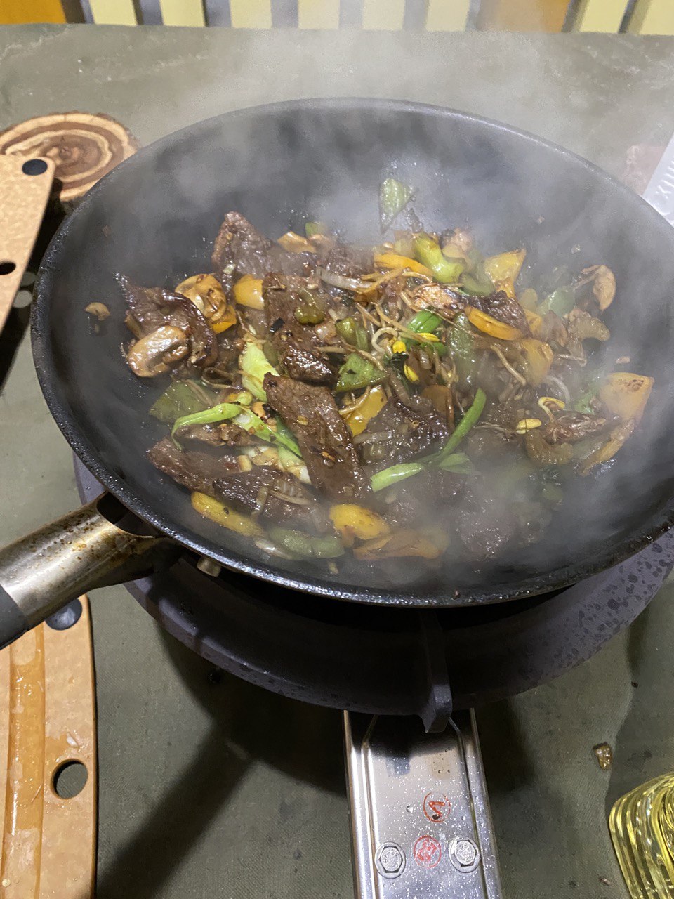 Несмотря на алюминиевую сковороду, мясо удалось обжарить до готовности очень быстро, думаю, что минуты за 3-4. Был бы вок тонким и железным, времени ушло бы гораздо меньше, да и мясо получилось бы сочнее, в этом конечно оно немного передержалось внутри. Но, в принципе, очень близко к ожидаемому.