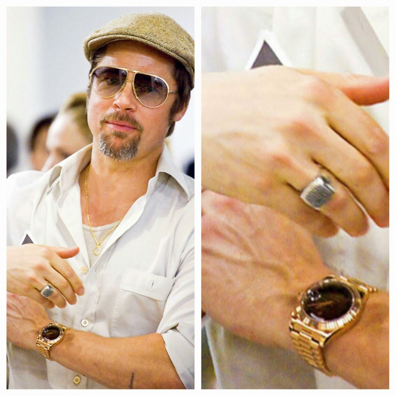 Да, носил он эту модель в 2009 году вроде во время премьеры фильма Бесславные Ублюдки. Но откровенно говоря великовата ему. 36 платина из 12 друзей оушена выглядит бомбически
