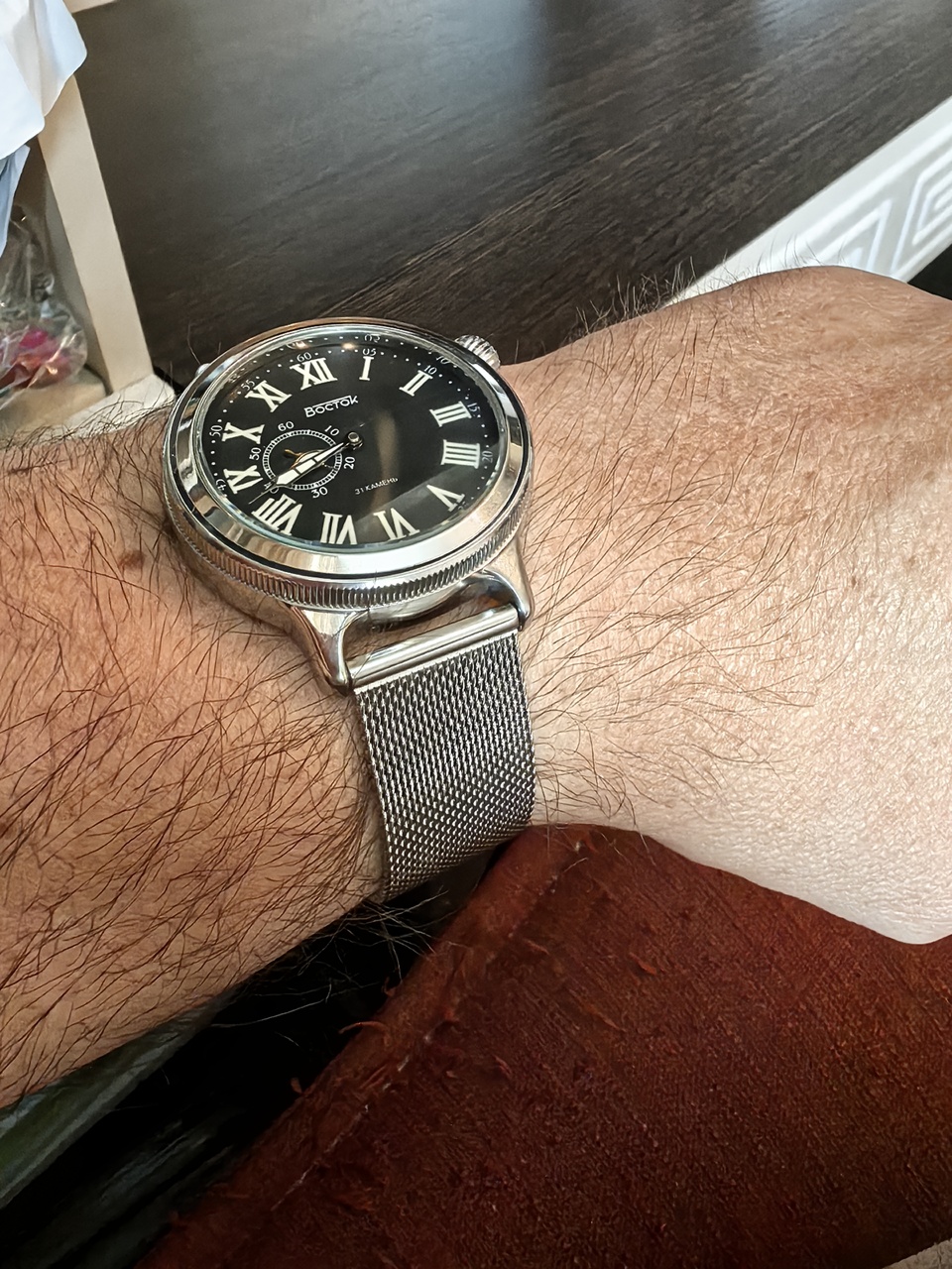 Только считаю, что этот браслет тут не очень. Со временем кожаный ремешок поищу. Наверное тёмно-коричневый. Всё таки типа винтажные часы.