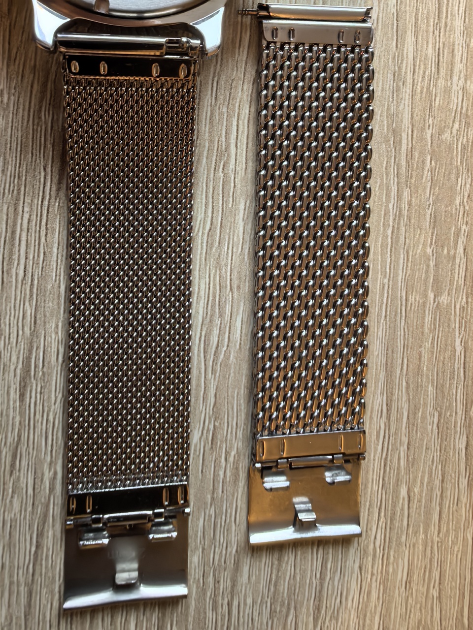 Вторые сутки ношу новинку. Не знаю, новинка ли это ещё? У меня уже есть часы в этом 550ом корпусе. Но без влагозащиты и с минеральным стеклом. В корпусе есть небольшое различие. В новых часах ушки изнутри немного проточили так, что туда стал легко заходить браслет. В старом варианте это можно было сделать только с помощью кувалды. Ну есть у меня похожий браслет от berny, который еле смог всунуть между ушек, и он там немного подклинивал. В новом корпусе браслеты становятся отлично. Вот на фото штатный браслет и от berny. Штатный с более крупным плетением но за то и более гибкий. Но нет системы быстрой смены, в отличии от berny. По мне там штатный больше подошёл к этим часам. Ну внешне. Был небольшой люфт в ушках. Но он из-за тонких штифтов. Вставил штифты из старого корпуса, теперь штатный браслет не люфтит. Тут видимо какие были на складе штифты, такие и поставили.