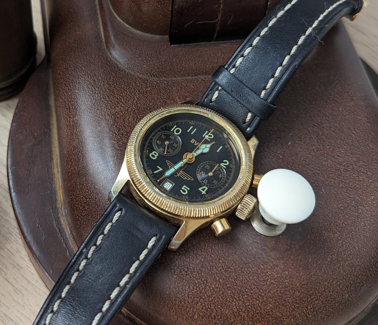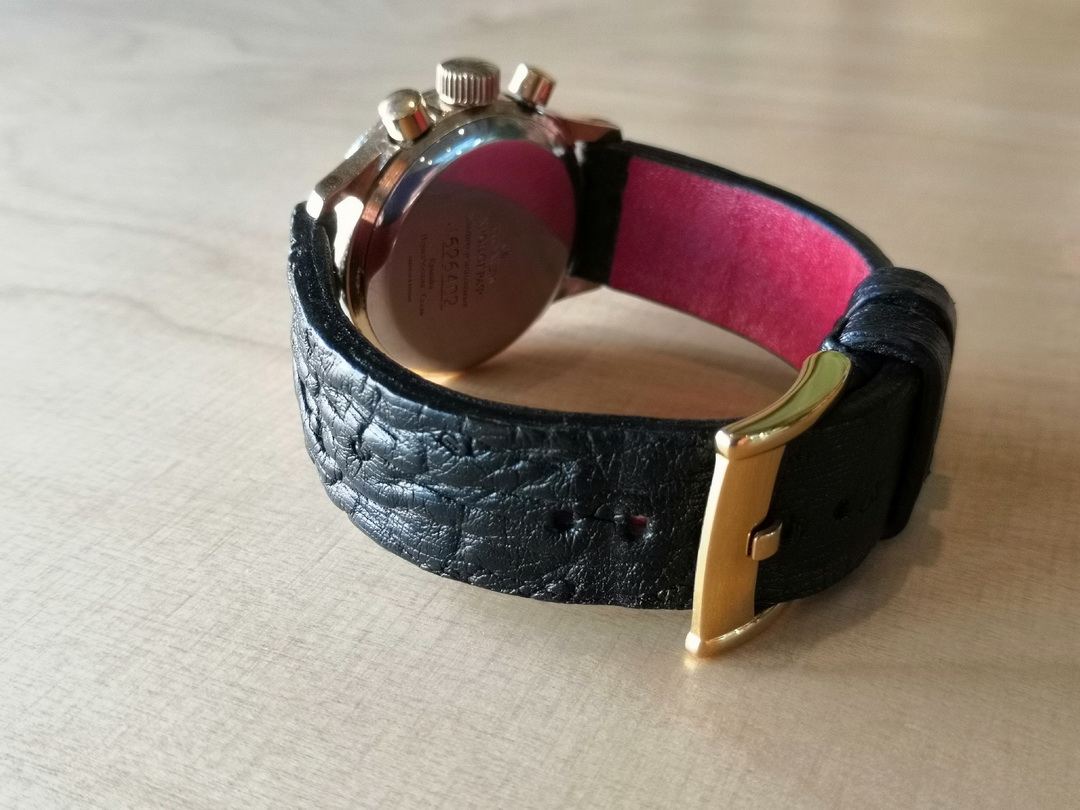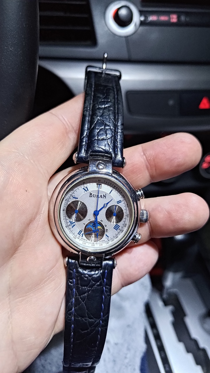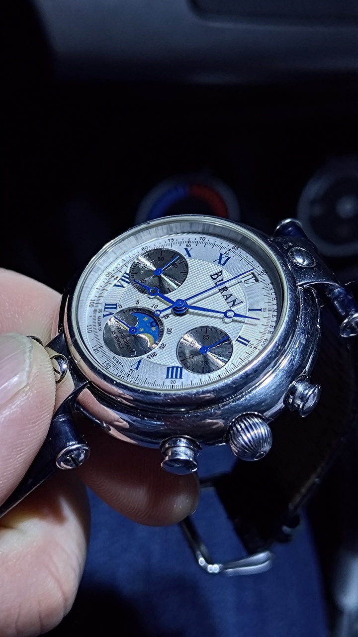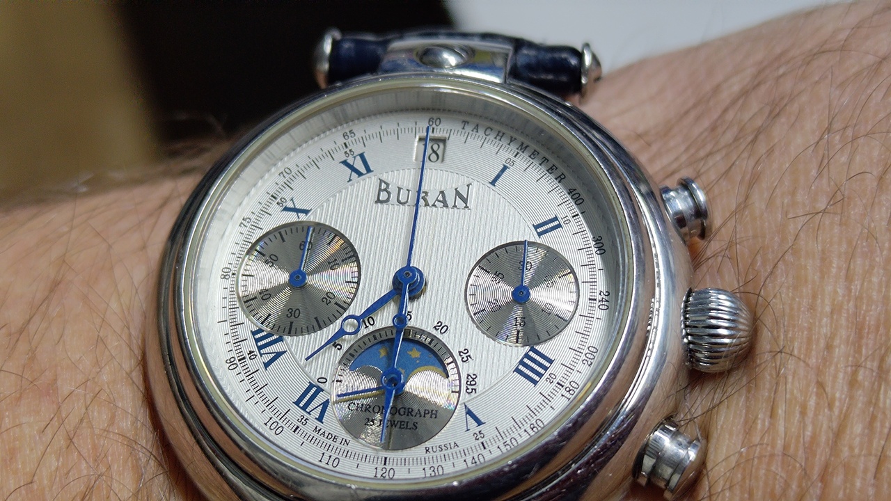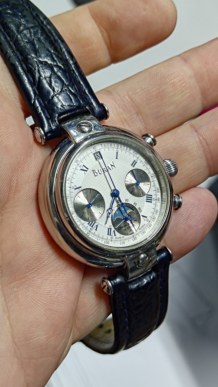 В наличии были лимитированные часы Российского производства с хронографом и фазами луны «Буран». Корпус у часов из нержавеющей стали, позолоченный цвета красное золото, размер: 36х39 мм.