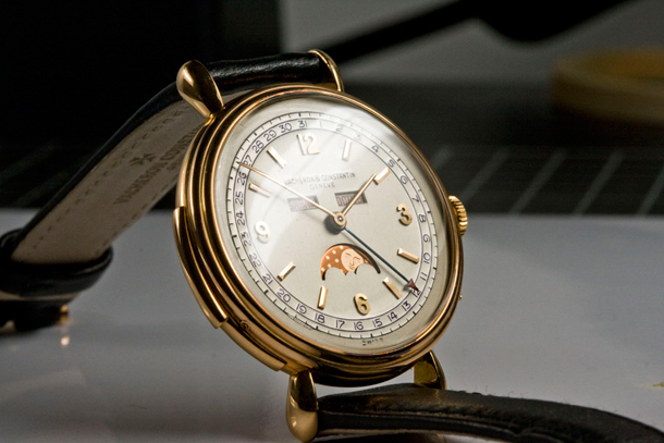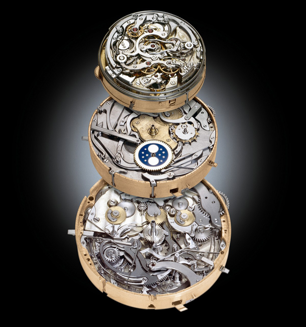 Раздел II - Наручные часы В обратном порядке рассмотрим пятерку самых сложных часов в этой категории от VC Одними из самых первых наручных часов Vacheron Constantin с большим количеством усложнений был референс 3620 1936 года выпуска. Сделанные под заказ для клиента из Испании, эти уникальные часы продолговатой формы включают в себя день недели, ретроградную дату и минутный репетир. Цифры на циферблате нанесены синим цветом в отличие от привычного черного. Эти наручные часы считаются самыми первыми, в которых использовалась ретроградная шкала (эта тенденция получила свое широкое распространение в часовой промышленности шестьдесят лет спустя). До возрождения механических часов в конце 80-х Vacheron Constantin не создавал слишком сложных наручных часов, кроме одного образца, который на то время был великолепным и необыкновенно большим – референс 4293 с диаметром 38 мм. Этот минутный репетир с тройной датой и фазой луны в корпусе из розового золота был выпущен в 1943 году и продан в 1957 году. 5) референс 30020 (референс 30040) – 6 усложнений – 1992 (2006): Минутный репетир День недели Дата Месяц Вечный календарь Фаза луны Конец 80-х годов принес возрождение механических часов после кварцевого кризиса, который сильно омрачил швейцарскую часовую промышленность. Мануфактуры возрождались и Vacheron Constantin решил вернуть свои сильные позиции, добавив одни из самых сложных часов в свою коллекцию: минутный репетир. В 1998/1999 годах марка начала работу над колоссальным проектом, предложенным двумя людьми: Марселем Гоем, техническим директором, и Джеральдом Дюбуа, изготовителем механизмов. Целью было создание мифического механизма, который бы соответствовал экстра плоскому механизму репетира, который бренд использовал в 40-х годах. Важно было понять формулировку задания. Сложность заключалась в отсутствии оригинальных эскизов Калибра. Из-за кварцевого кризиса остро ощущалась нехватка целого поколения создателей часов, конструкторов, инженеров и т.д., которые обладали собственным ноу-хау в работе над подобными проектами. Vacheron Constantin пришлось начинать все с нуля. Это было испытанием - взять отдельно старинный механизм, изучить его и попытаться усовершенствовать. Одной из главных трудностей, кроме сохранения Калибра тонким, было создание идеальных гонгов, которые могли бы воспроизводить не только громкий бой, но и хрустальный перезвон. Волшебная формула была найдена. Vacheron Constantin исследовал разные пути получения лучшего звучания. Одним из секретов стала адаптация каждого отдельно взятого корпуса в каждому отдельному механизму (приспособленный к корпусу механизм мог звучать идеально, и совсем неважно звучать в другом корпусе). В 1992 году был представлен Калибр 1755 в двух версиях: обыкновенный и вечный календарь из желтого золота и платины. Механизм репетира толщиной 3.28 мм сейчас обновлен модулем вечного календаря и составляет 4.9 мм. В корпусе размером 36 мм репетир был красивой моделью, выпущенной в честь грушевидных репетиров. Вечный календарь выглядел традиционно и выпускался в духе карманных часов 19-го века, где индикация месяца подается в 4-летнем периоде без дополнительной стрелки для обозначения високосного года. В 2006 году Калибр 1755QP (Quantiеme Perpetuel – вечный календарь по-французски) использовался в круглой модели Malte (корпус 41 мм из розового золота), придавая часам более современн