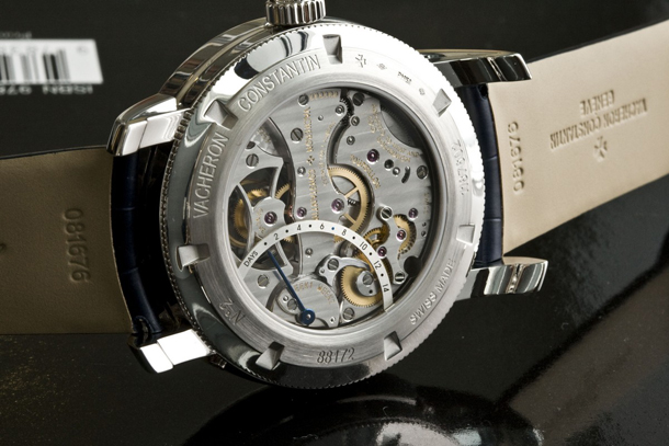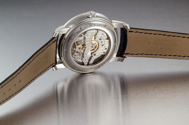 Новинка выполнена в классическом лаконичном стиле, имеет круглый корпус из платины, диаметром 42 мм (предыдущая версия этой модели была с корпусом диаметром 40 мм), толщиной 7,3 мм. Сапфировое стекло на лицевой стороне корпуса и на его задней крышке. Циферблат из платины с мелкозернистой пескоструйной отделкой, накладными часовыми индексами из 18-каратного белого золота, и стрелками, изготовленными из платины. Модель оснащена мануфактурным ультра-тонким автоматическим механизмом Vacheron Constantin 1120, толщиной 2,45 мм, с функциями индикации часов и минут (посредством центральных стрелок). Калибр отменно отделан и отмечен Женевским клеймом. Темно-синий ремешок из кожи аллигатора с платиновой застежкой. Лимитированный выпуск 150 экземпляров. Источник: http://www.motomax.nl/watch-news/797...f-winding-42mm