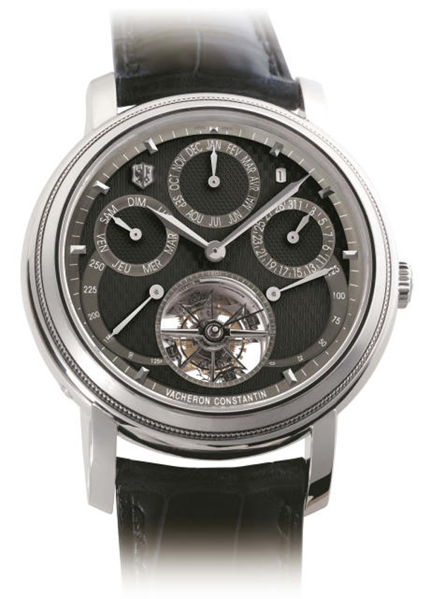 Турбийон Минутный репетир Индикатор запаса хода День недели Дата Месяц Индикатор цикла високосного года Вечный календарь Фаза луны Время второго часового пояса Индикация запаса хода механизма боя Уравнение времени Восход Закат Карта неба Празднование 250-й годовщины мануфактуры в 2005 году было стратегическим событием, которое началось в 1999 году. Именно тогда перед командой специалистов было поставлено задание разработать концепцию специальных мемориальных часов. В часах должны были быть воплощены техническое мастерство и потенциал, которые компания обрела за 250 лет своей истории. Всего было выпущено 7 экземпляров между 2005 и 2007 годами. А уникальная версия с черным циферблатом была продана на аукционе Antiquorum 3 апреля 2005 года за 1 876 250 швейцарских франков, став самыми дорогими современными часами, проданными с аукциона. Создание часов с индикацией на обеих сторонах корпуса заняло 4 года (2000-2004). Конструкторы VC создали Калибр 2750 (834 детали). Как создать очень сложные часы, сохранив при этом изящность корпуса? Это было первым препятствием, которому противостали дизайнеры. Первым шагом была разработка модели в программах CAD и 3D, чтобы быстро оценить минимальные размеры корпуса для Калибра размером 36 х 11.25 мм. Вторым шагом были эскизы и рисунки, особенно все, что было связано с ушками и их специфической формой. Затем ушки часов были спроектированы в 3D. Тот факт, что диаметр механизма составляет 36 мм, никого не расстроил, а вот толщина Калибра 11.25 мм и требования двусторонней индикации – эта задача заставила главного дизайнера Винсента Кауфмана хорошо «поломать голову». Первый удовлетворяющий запросам вариант корпуса был огромным – 50 мм, и это без учета ушек! Но это было невозможным по причине того, что такие часы очень неудобно сидели бы на запястье. Команда создавала различные модели, используя стерео литографию. В итоге получился оптимальный размер – 47 мм в диаметре и 17.8 в толщину. Этот размер встречается в современных моделях часов, которые относятся к спортивному часовому сегменту или к тем, которые хотят произвести незабываемое впечатление. Vacheron Constantin хотели создать классические часы, которые выглядели бы сдержанно. Чтобы сократить значение толщины, дизайнеры воспользовались приемом искривления корпуса. Конструкция корпуса была поделена на 3 части: безель, обратная и лицевая стороны корпуса. Следующей сложностью была форма ушек часов. Они должны были быть загнутой формы без прямых грубых линий, которые бы визуально прибавили весу часам. Представляя собой ¼ часть мальтийского креста, вогнутые ушки припаивались к корпусу. Вся сложность работы требовала обработки вручную. Благодаря конструкции, в которую интегрированы все элементы, часы не имеют вид многослойного бутерброда. Их удобно носить и все пропорции гармоничны. Tour de l’Ile были первыми часами в честь юбилея и все последующие были вдохновлены этой моделью и впитали в себя ее эстетику. Помимо размеров корпуса следующей трудностью было размещение 7-ми корректирующих кнопок, коронки и кнопки репетира. Механизм управления репетиром было расположено на безеле, который нужно было повернуть для его активации. Новая модель очаровывает технологическим мастерством и грандиозной сложностью; циферблат является природным продолжением часов, являясь их «лицом». В Tour de l’Ile 12 стрел