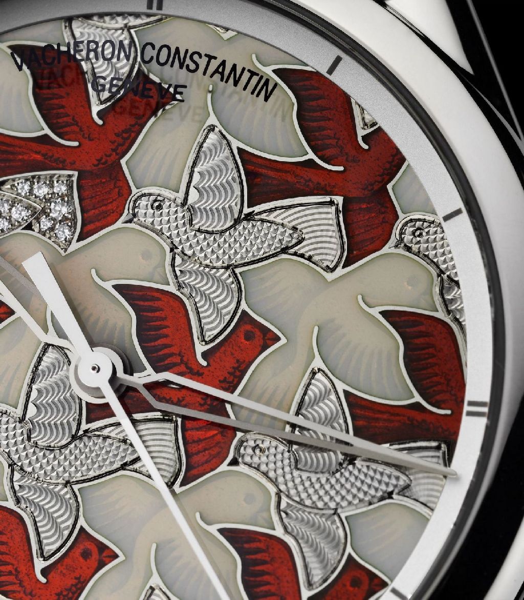 Круглый корпус из 18-каратного белого золота, диаметром 40 мм, водонепроницаемый до 30 метров. Сапфировое стекло на дицевой стороне корпуса и на его задней крышке. На последней выгравированы надписи: "Only Watch 2011" и "Piece Unique". Рисунок на золотом циферблате выполнен по картине Морица Корнелиса Эшера (Maurits Cornelis Escher, 1898-1972) - голландского гравера и графика. На нем изображены летящие белые и красные голуби. Кстати, это цвета аукциона Only Watch, а голуби - символ надежды и любви. Изображение выполнено в технике гравирования с выемчатым эмалированием, в том числе, красные птицы - просвечивающегося эмалирования, белые птицы - опалесцирующего эмалирования, золотые птицы - ручного гильоширования, а одна птица инкрустирована 40 бриллиантами, общим весом 0,08 карат. Модель оснащена мануфактурным автоматическим механизмом Vacheron Constantin 2460 SC, диаметром 26,20 мм, толщиной 3,60 мм, состоящий из 182 деталей, на 27 камнях, с балансовой частотой 28800 полуколебаний в час (4 гц), запасом хода 40 часов, функциями индикации часов, минут и секунд (центральные стрелки). Калибр отлично отделан и отмечен Женевским клеймом (Hallmark of Geneva). Черный ремешок из крокодиловой кожи с застежкой из 18-каратного белого золота. Вложение 141192Вложение 141193 Вложение 141191 Источник: http://www.horozima.com/2011/06/vach...iers-dart.html