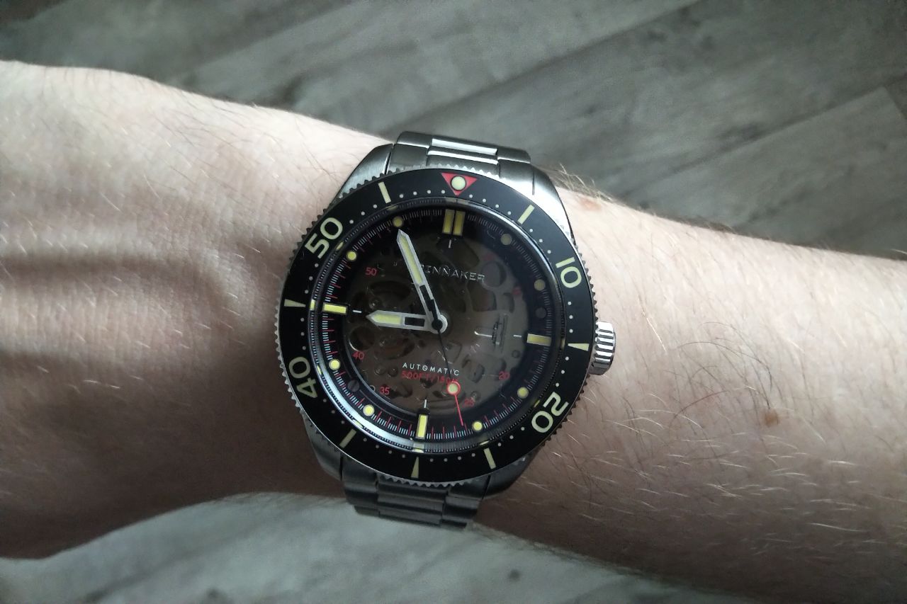 Вполне себе симпатичные часики, разве что в плане цены не очень привлекательны. Не обошлось без косяков. Если присмотреться, то видно, что последняя буква R стоит чуть ниже остальных. Люм слабоватый. Браслет нормальный, нигде не закусывает, удобная застежка, дайверское расширение. Из личных придирок - открытая задняя крышка. Если так посмотреть, то у многих моделей Spinnaker одинаковые открытые крышки и это скучно. Могли бы хотя бы как-то по разному оформить ротор или же сделать интересную крышку с глубокой гравировкой. Кстати, нигде на корпусе нет названия модели и без поисковика я даже не вспомню, что это за модель