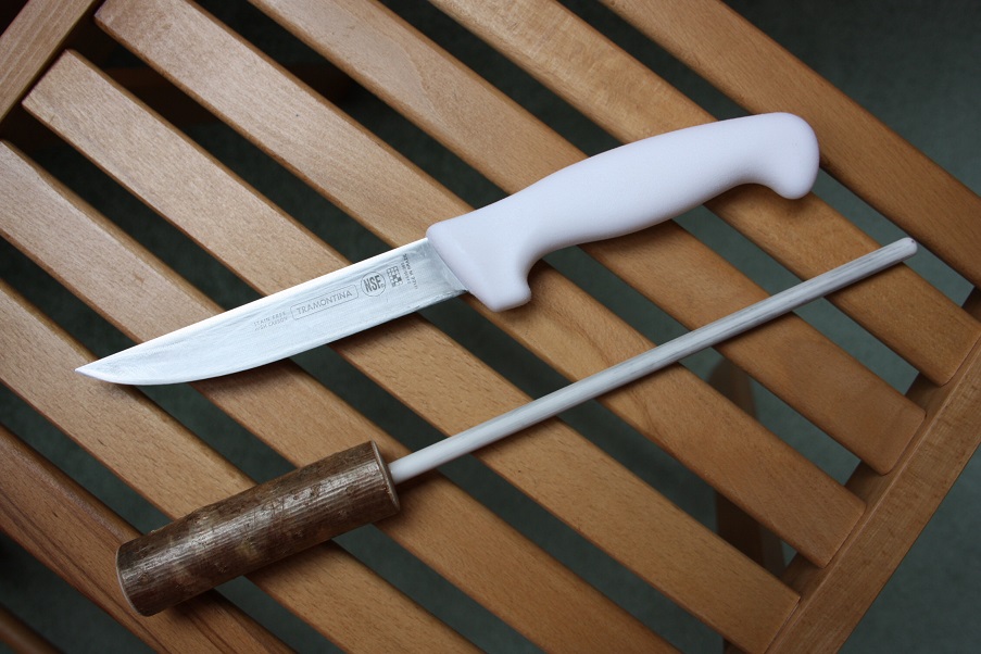 Про Трамонтину: я не знаю из какой стали она, это не имеет никакого практического значения. Я знаю, что её используют профимясники и что она доминирует в мясных рядах наших рынков. Потом, следуя их примеру, покупаем этот 10-ти долларовый нож, подходим к туше лося или секача кил за 200 и раскладываем мясо по пакетикам. И чувствуем разницу. Мягкий нож с 56 ХРС из хайкарбонстайнелессстил (не знаю что это такое в процентах С, Хр, Мо, Ва, да и пофигу мне)+муссат (на фото ниже ножа) рвёт любую мегасталь по энергозатратам при разделке. А по деньгам просто разрывает термоядерным взрывом.