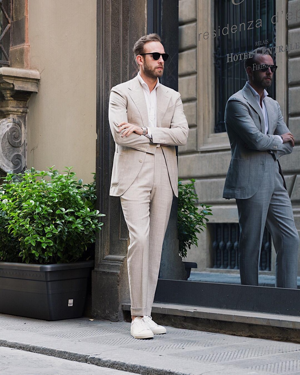 Начнём с того, что в принципе любая комбинация деловых костюмов со спортивной обувью - это сомнительная вещь. Просто можно сделать совсем плохо и надеть здоровые яркие NB, выше пример приводили. Можно попытаться замаскировать кроссовки под туфли: что-то непонятной формы, чёрного цвета, полуботинки-полукроссовки. Это, имхо, ещё хуже NB, т.к. всегда выглядит очень дешево. А можно взять минималистичного спокойного дизайна однотонные кеды без каких-либо логотипов.