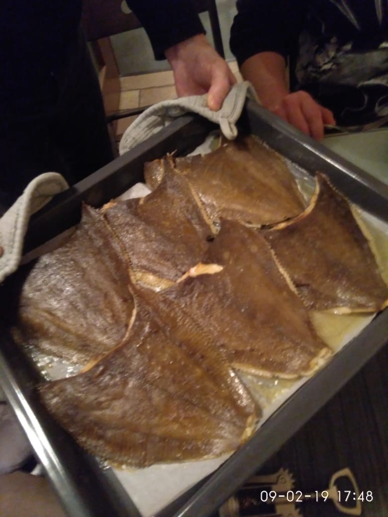 В итоге тимьян просто подложили под рыбу (отличная некрупная камбала, поэтому некуда было тимьян прятать))), плюс к этому всё-таки не удержались и дали рыбе минут 10 полежать, повпитывать чем натёр. Сковородки-гриль нет, поэтому просто сделали спаржу и брокколи в пароварке. Овощами готовое блюдо не украшали, просто сделали в стол большую тарелку, у дам было белое вино, другу хорошо пошла текила.